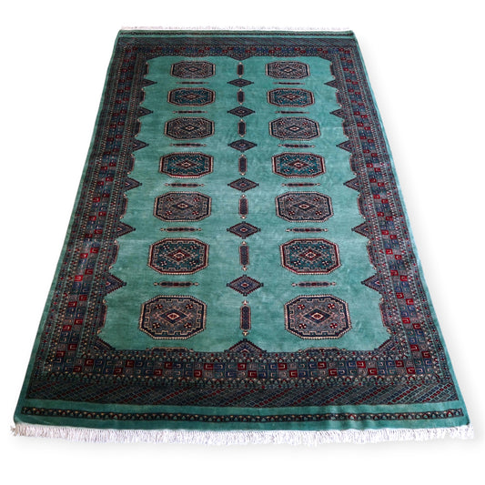 パキスタン手織り絨毯 239×155cm|高密度ウール ニュージーランドウール使用 緻密織り グリーン系 トライバルデザイン