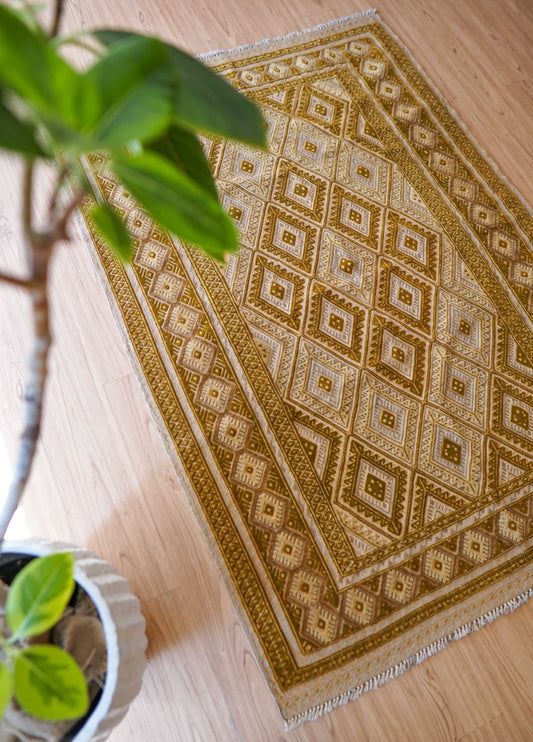 キリムは平織りの軽やかなラグで、幾何学模様やカラフルな配色が特徴です。モダンなインテリアとの相性も良く、敷物としても壁掛けとしても人気があります。