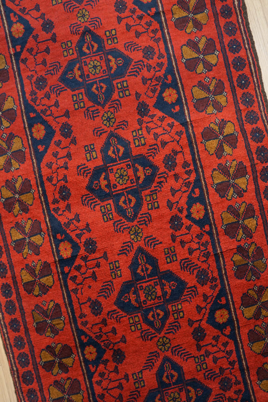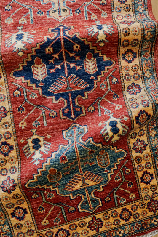 アフガニスタン手織り ガズニウールラグ 317×78cm|カザクデザイン・ロングランナー|赤×ブルー
