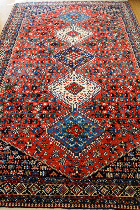 ペルシャ手織り絨毯 ヤラメ 304×204cm|伝統幾何学文様・赤基調の落ち着いた一枚