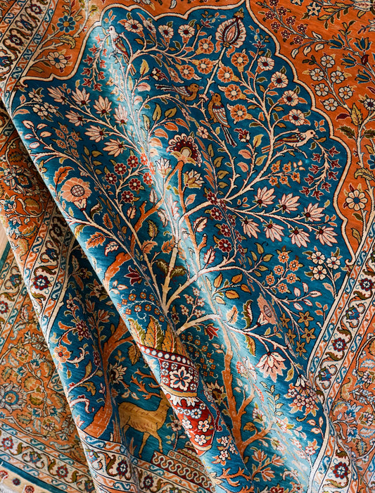 ペルシャ絨毯 クム産 クム産シルク100%のペルシャ絨毯は、繊細な文様と絹特有の光沢を兼ね備えた、まさに“芸術品”と呼べる逸品です。イラン・クム地方の熟練職人が、細かいノット数で丁寧に織り上げた絨毯は、滑らかな質感と角度によって変化する美しい光の表情が特長です。 装飾性と耐久性を兼ね備え、リビング、応接室、床敷きや壁掛けアートとしてもお使いいただけます。一点一点が手織りのため同じデザインは存在せず、長く使うほどに味わいを増す資産価値のある絨毯です。