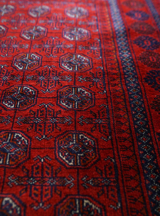 アフガニスタンの伝統を受け継ぐアフガンラグは、深みのある色合いと幾何学的な模様が魅力。丈夫なガズニーウールを使用し、力強い個性を空間に与えます。