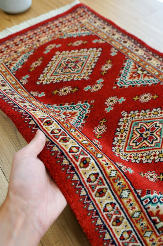 パキスタン手織り絨毯 玄関マット 78×49cm ファインクオリティ 赤基調 トライバルデザイン ウールラグ