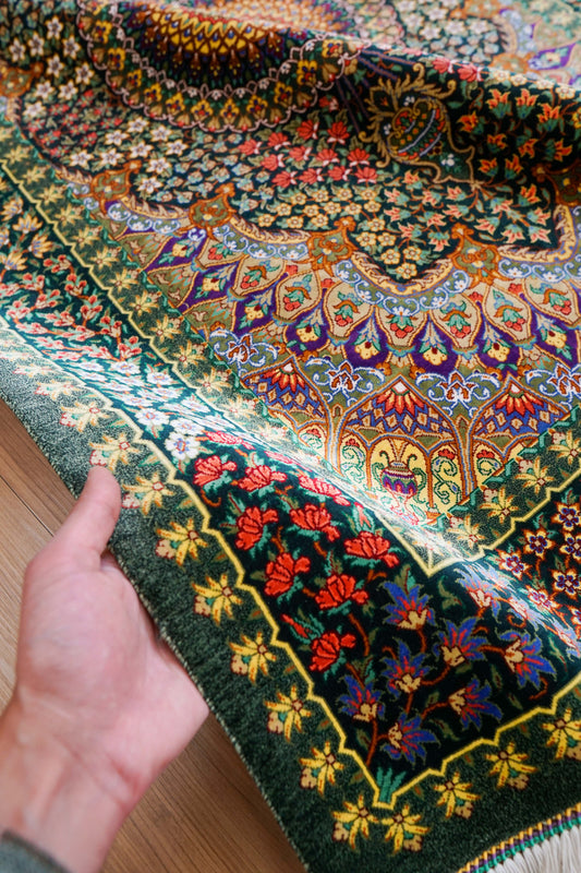 手織りペルシャ絨毯 クム産 タバタバイ工房 100%シルク 126×82cm|グリーンメダリオン・最高級シルクラグ