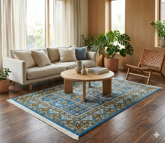 ペルシャ絨毯 クム産 クム産シルク100%のペルシャ絨毯は、繊細な文様と絹特有の光沢を兼ね備えた、まさに“芸術品”と呼べる逸品です。イラン・クム地方の熟練職人が、細かいノット数で丁寧に織り上げた絨毯は、滑らかな質感と角度によって変化する美しい光の表情が特長です。 装飾性と耐久性を兼ね備え、リビング、応接室、床敷きや壁掛けアートとしてもお使いいただけます。一点一点が手織りのため同じデザインは存在せず、長く使うほどに味わいを増す資産価値のある絨毯です。