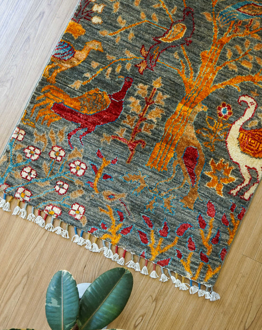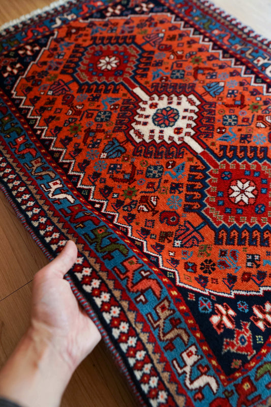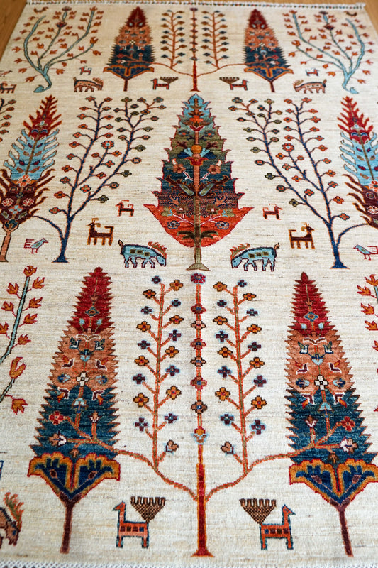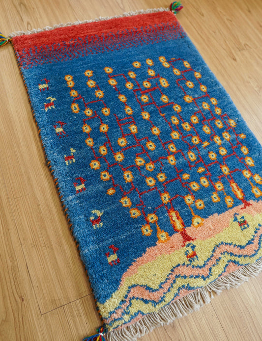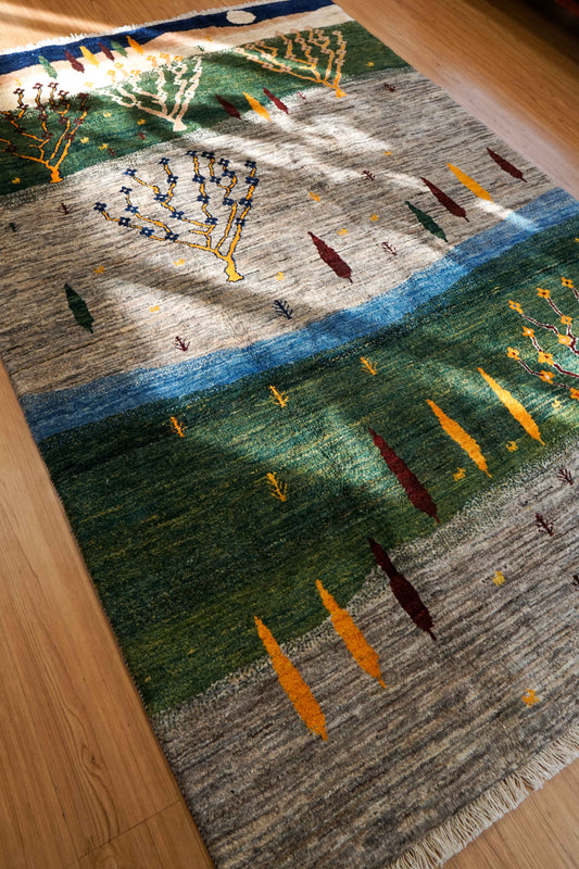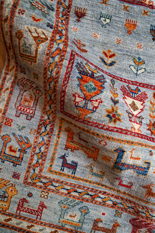 南イランの遊牧民によって織られるギャッベは、素朴で温かみのあるデザインが特徴。天然ウールと植物染料を使い、現代の暮らしにもなじむ手織りラグです。