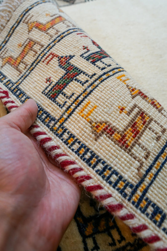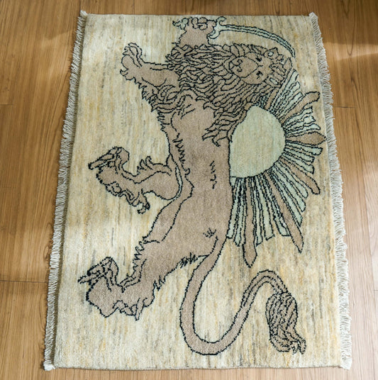手織りペルシャ絨毯 カシュクリギャッベ リズバフト 93×65cm|ライオンと太陽デザイン|高密度織り ウールラグ 玄関マット