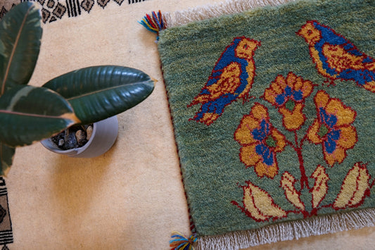 約40〜50cmの手織りラグ。どんな椅子や座席にもフィットします。ペルシャ絨毯やギャッベなど、遊牧民の歴史と文化を映すデザインが魅力で。椅子や床に敷くだけで本格的な織物の美しさを楽しめるコン