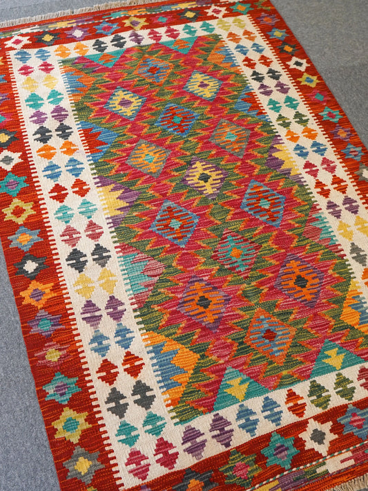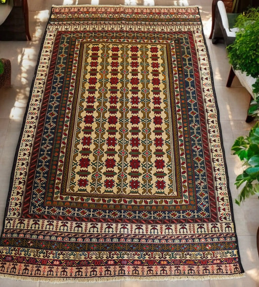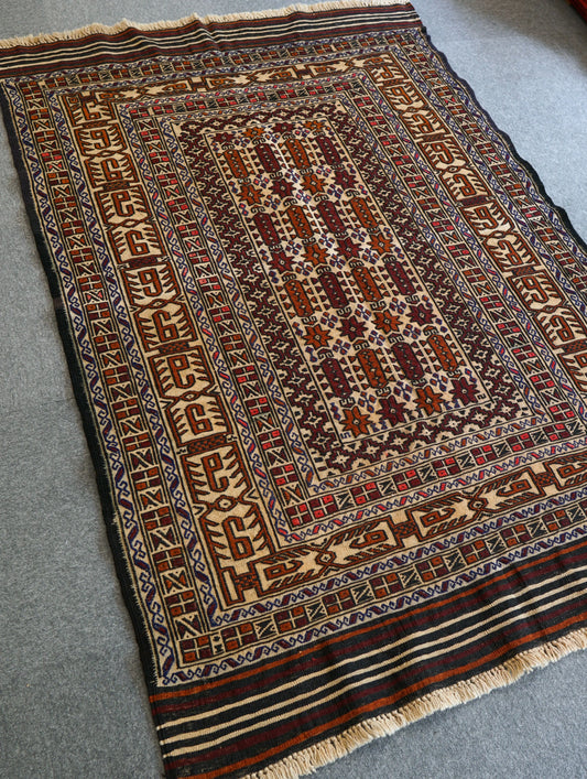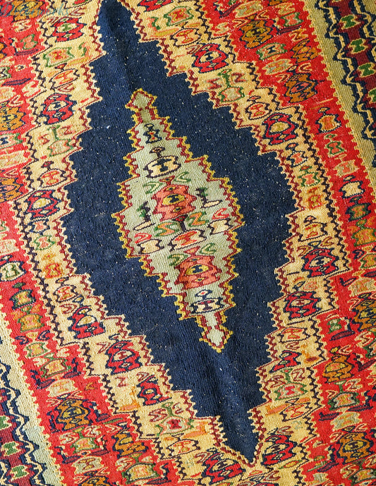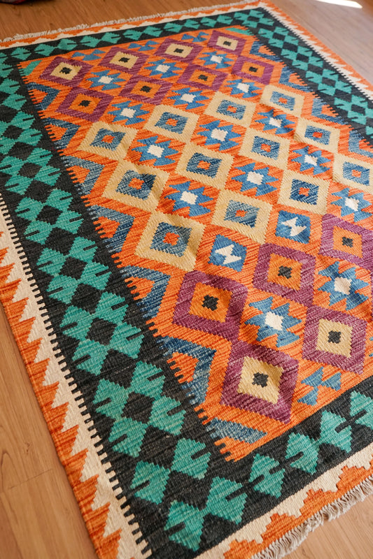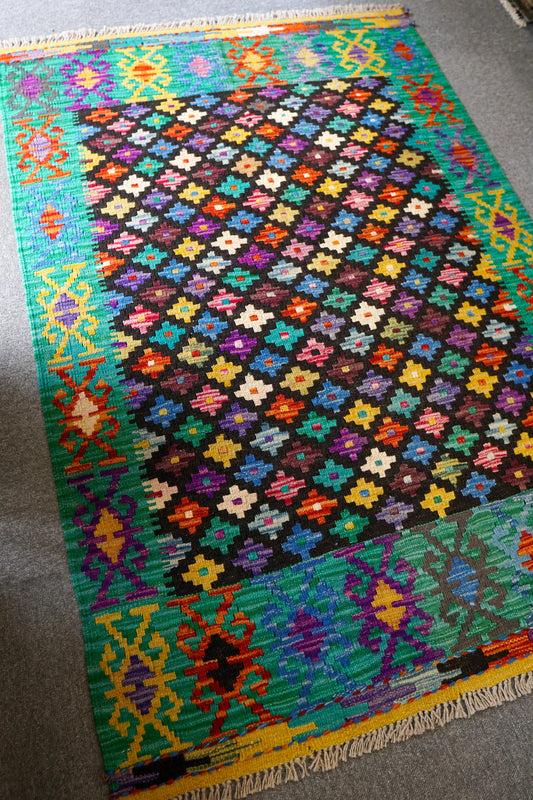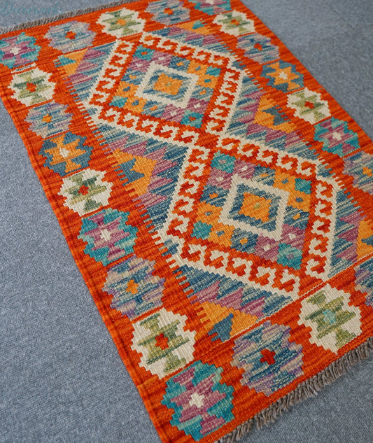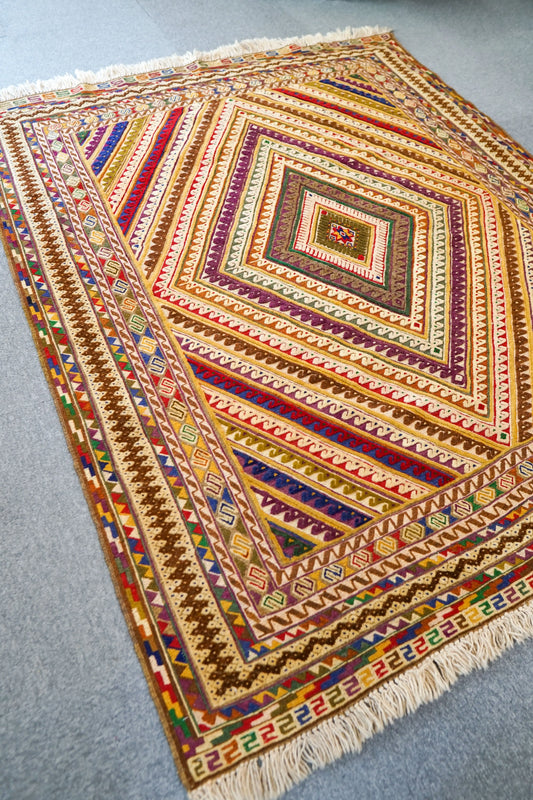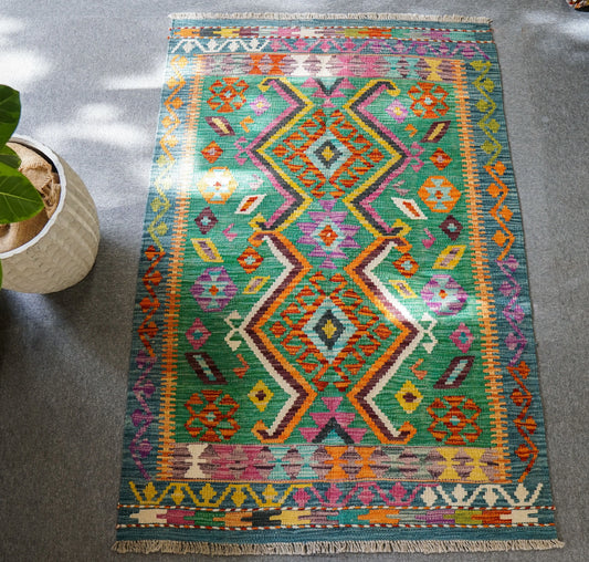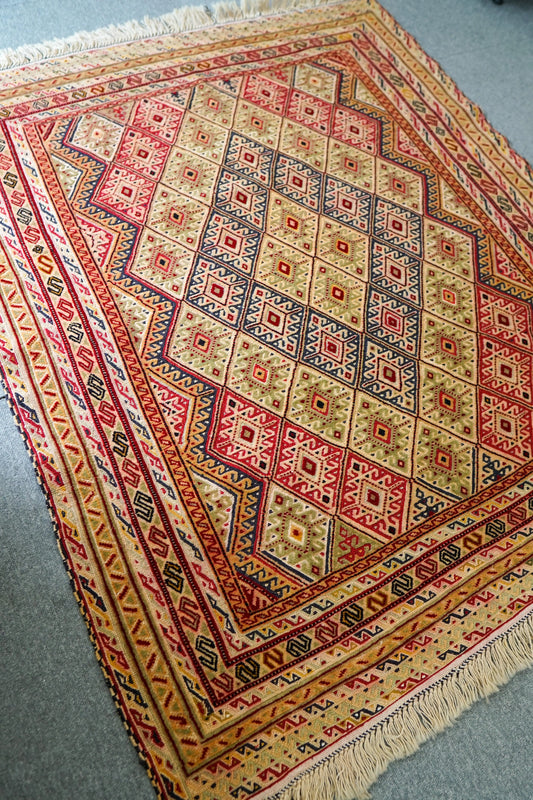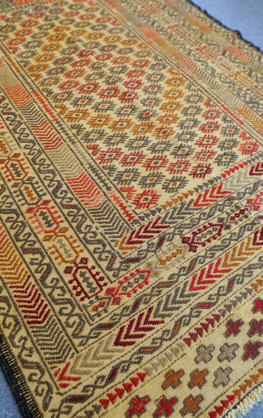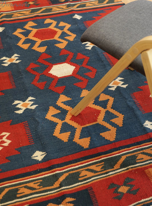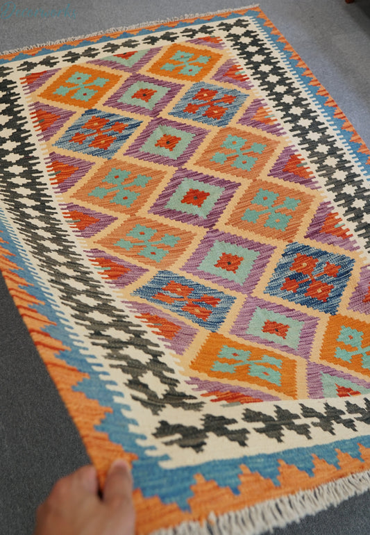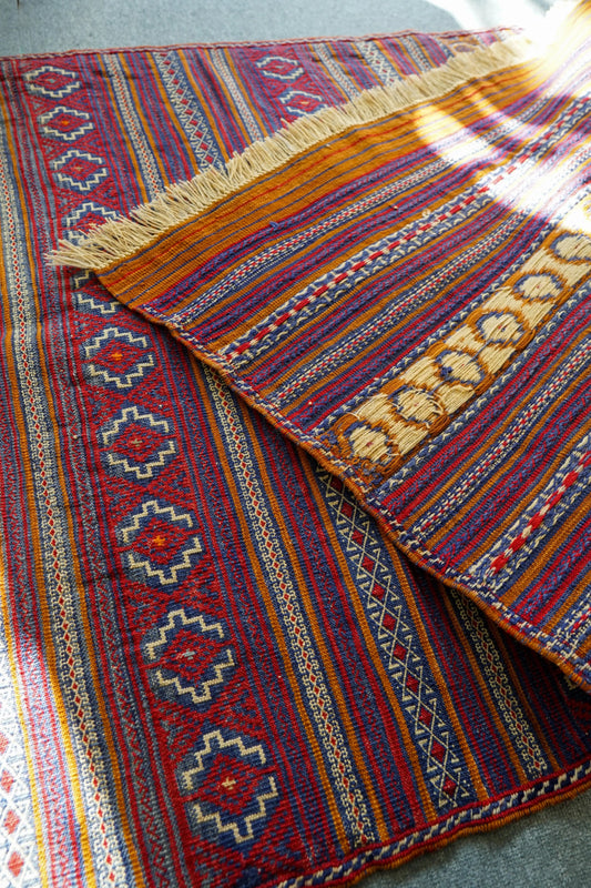 丈夫で軽いキリムは、ラグだけでなく壁掛けやカバーとしても活躍。季節を問わず快適に使え、空間に温かみと個性を添える理想的なインテリアアイテムです。