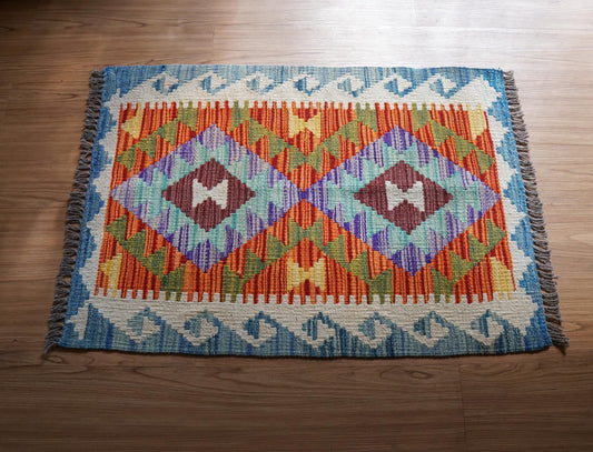 アフガニスタン手織りキリム 89×61cm 玄関マット 遊牧民伝統の平織りラグ