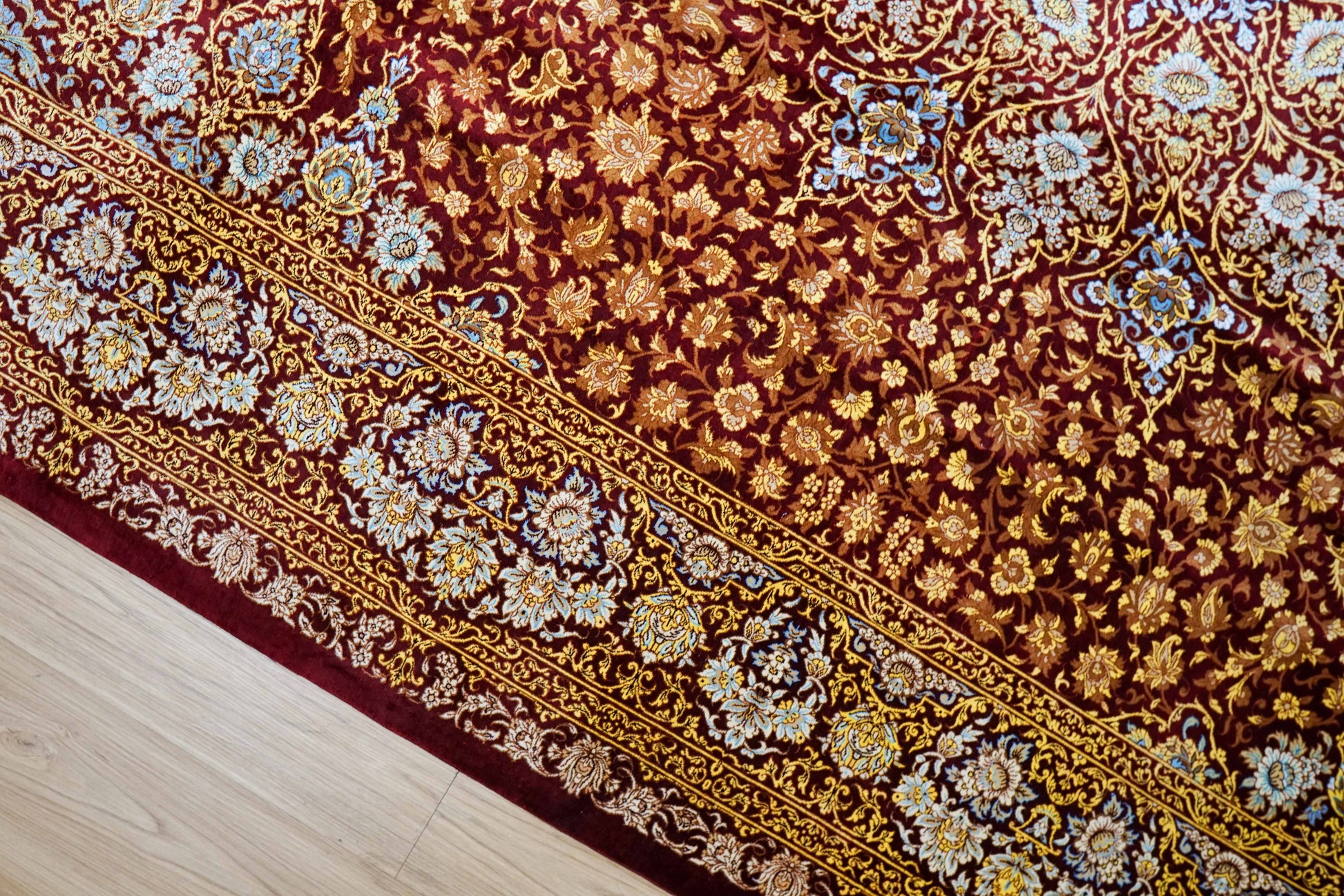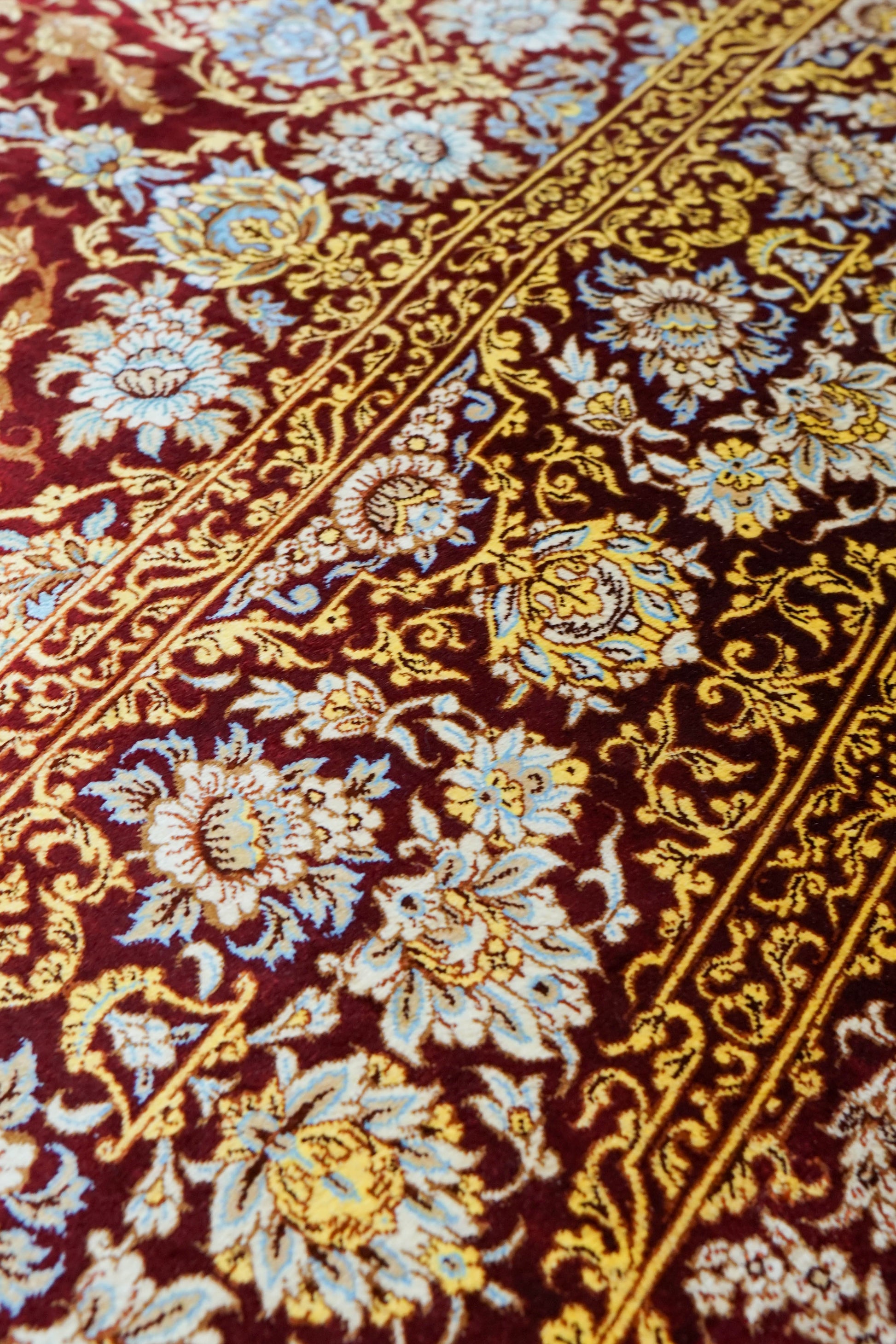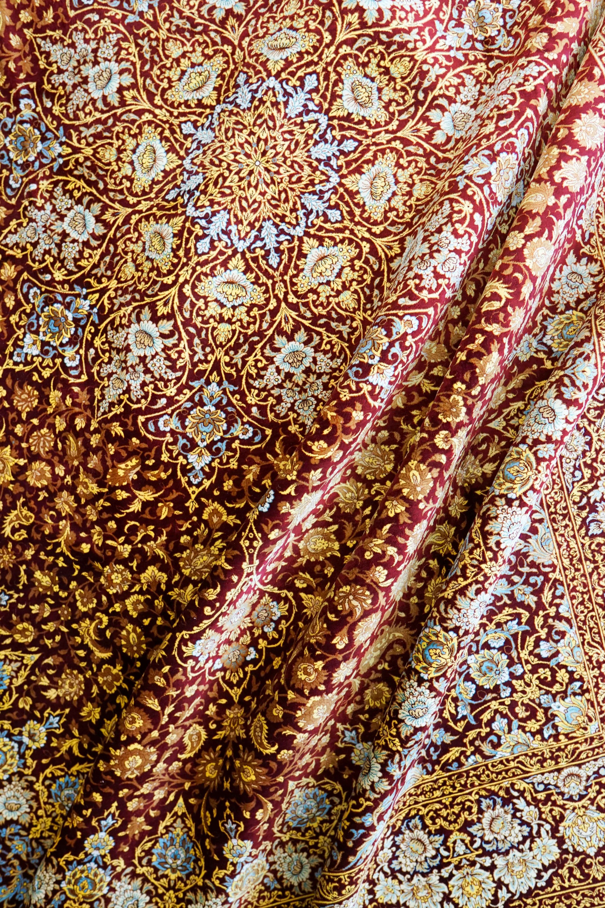 ペルシャ絨毯の中でも、ひときわ繊細で芸術性の高いことで知られるクムで織られた、アフマディ工房による総シルクの手織り絨毯です。