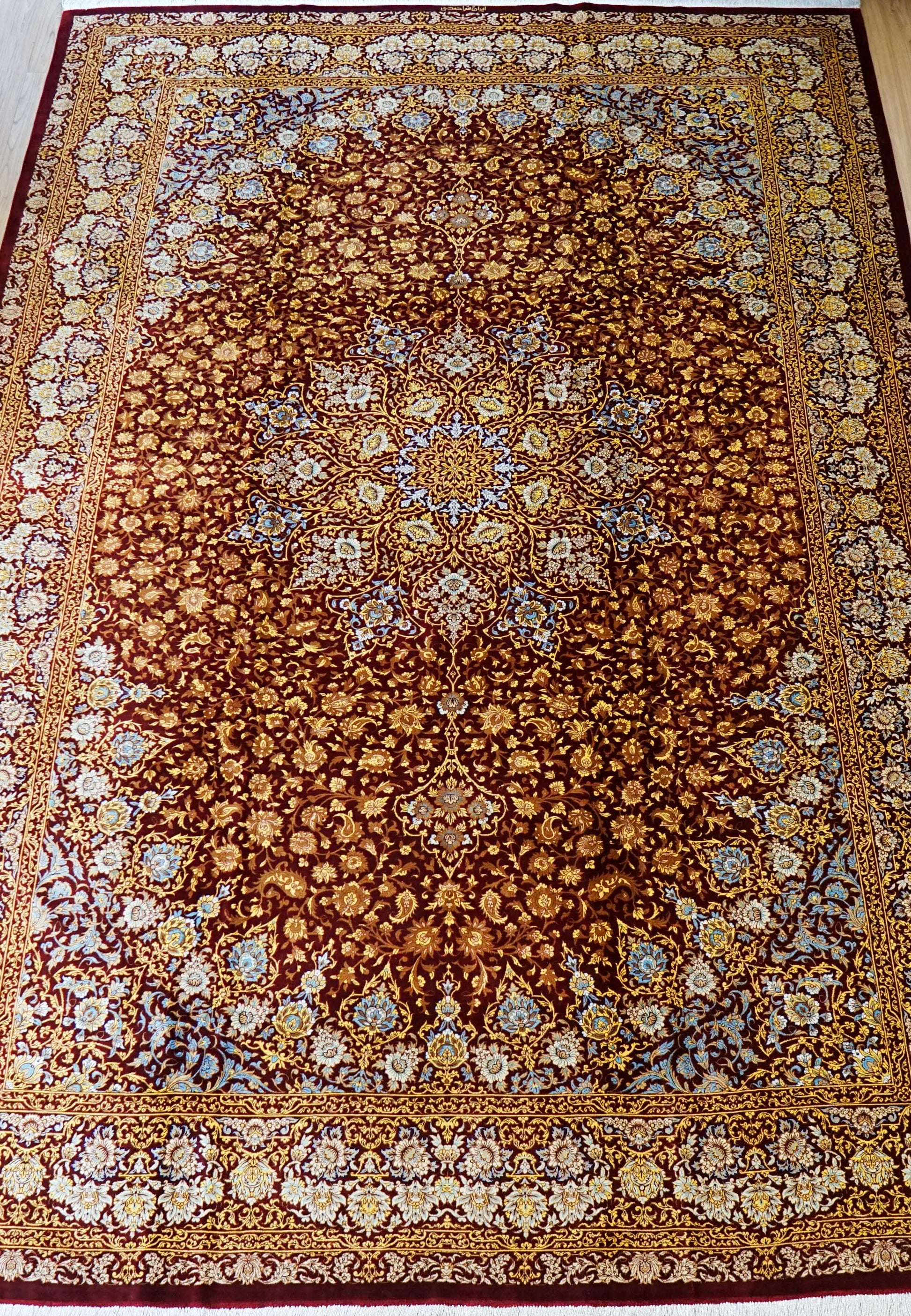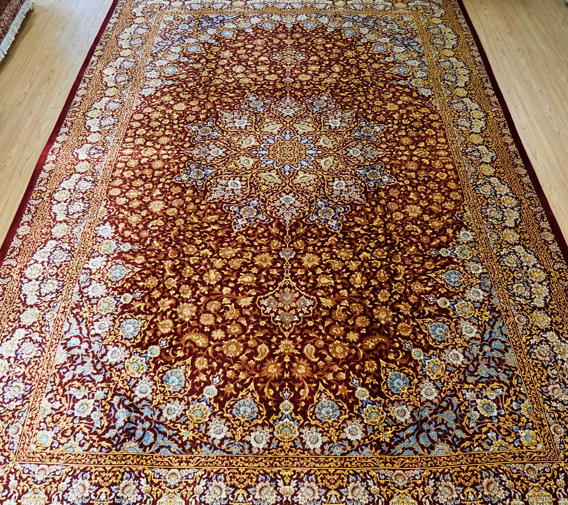 手織りペルシャ絨毯 クム産 アフマディ工房 100%シルク 300×204cm|総シルク 大判サイズ|精密メダリオンデザイン