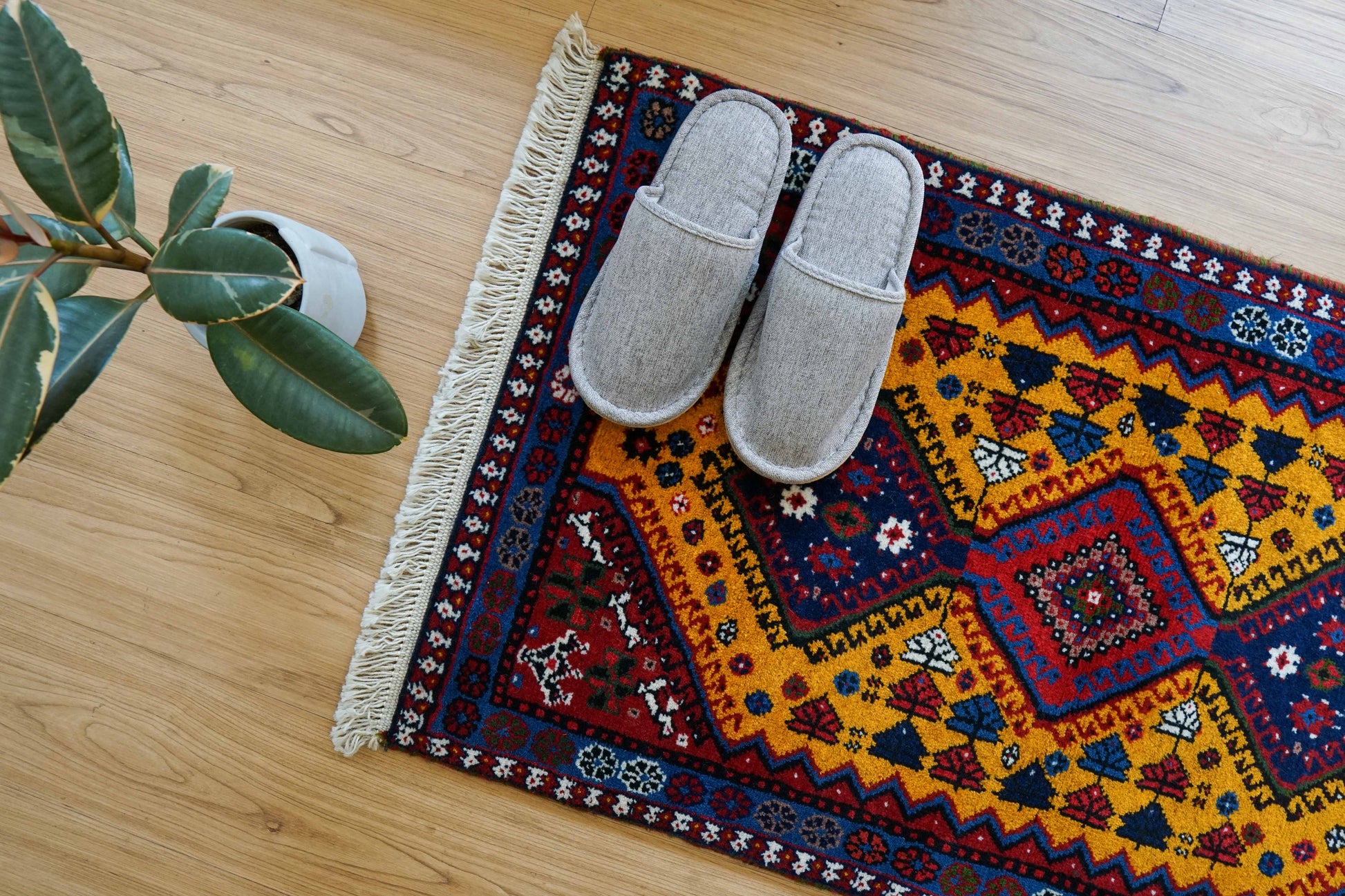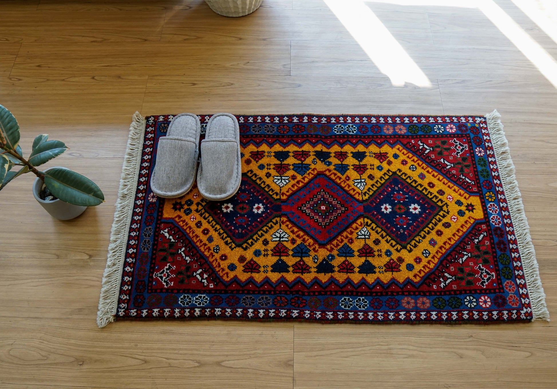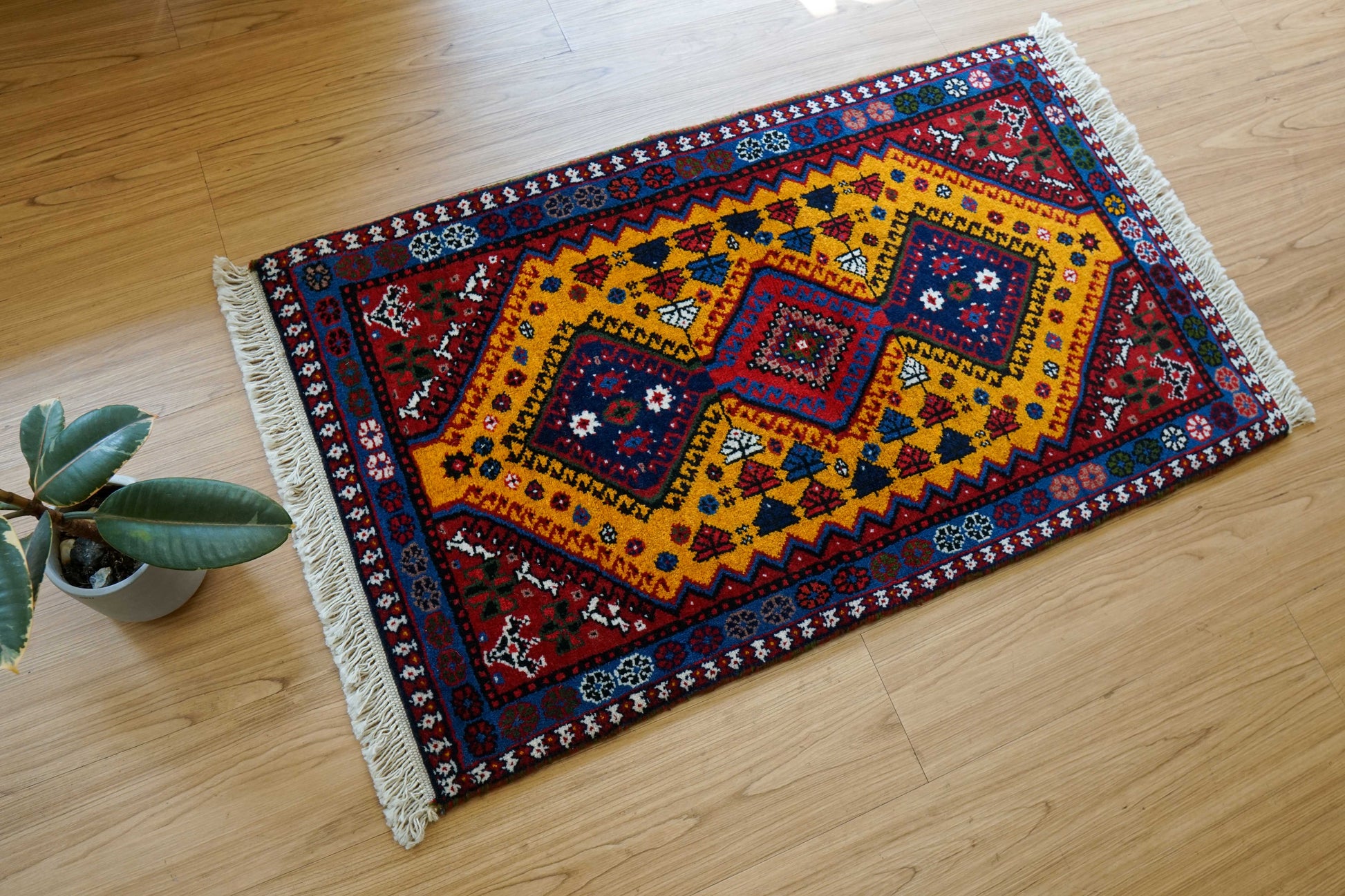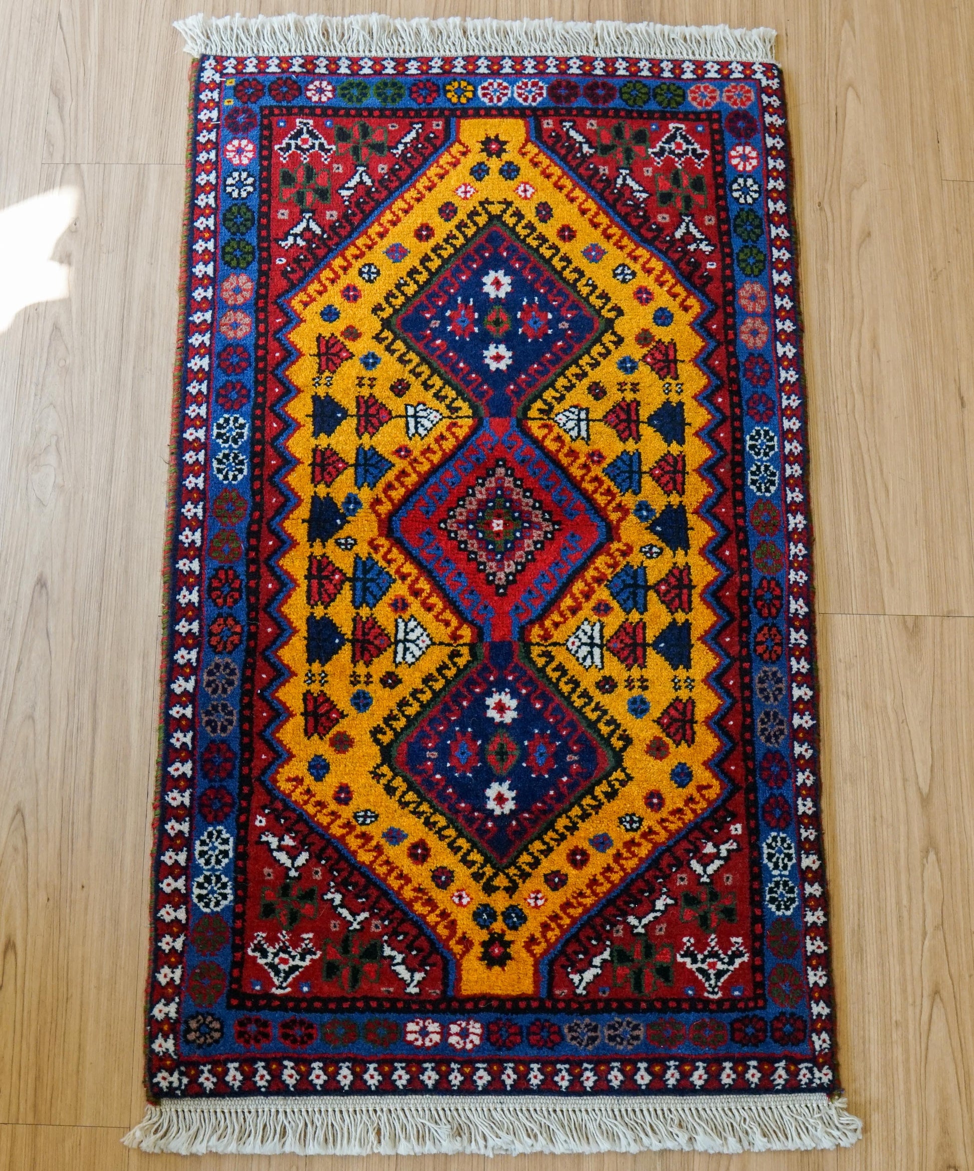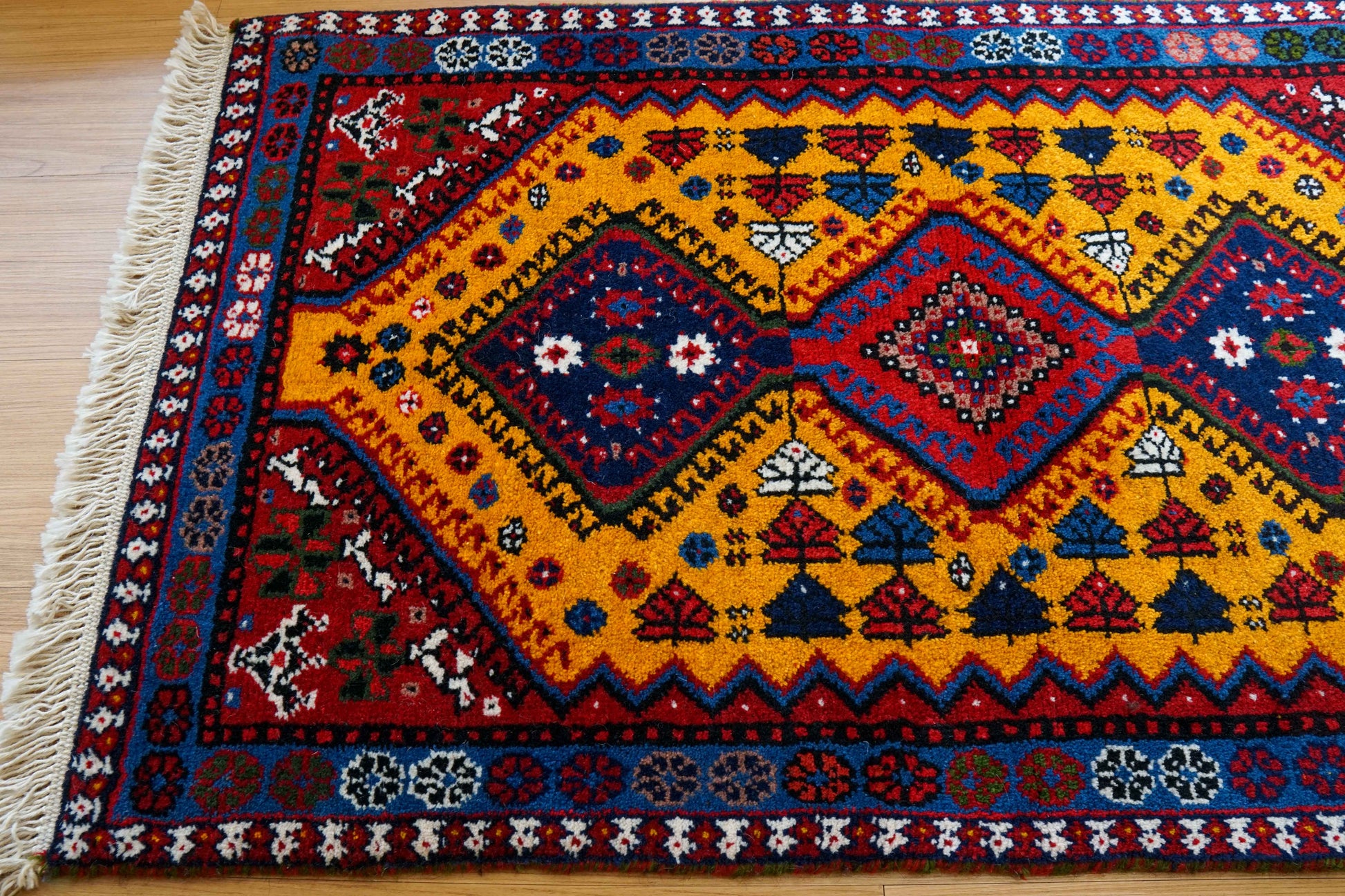 ヤラメは、はっきりとした幾何学模様と力強い色彩が特徴のトライバルラグとして知られています。この一枚も、深みのある赤をベースに、鮮やかなイエローとブルーが美しく組み合わされ、空間に明るさと存在感をもたらしま