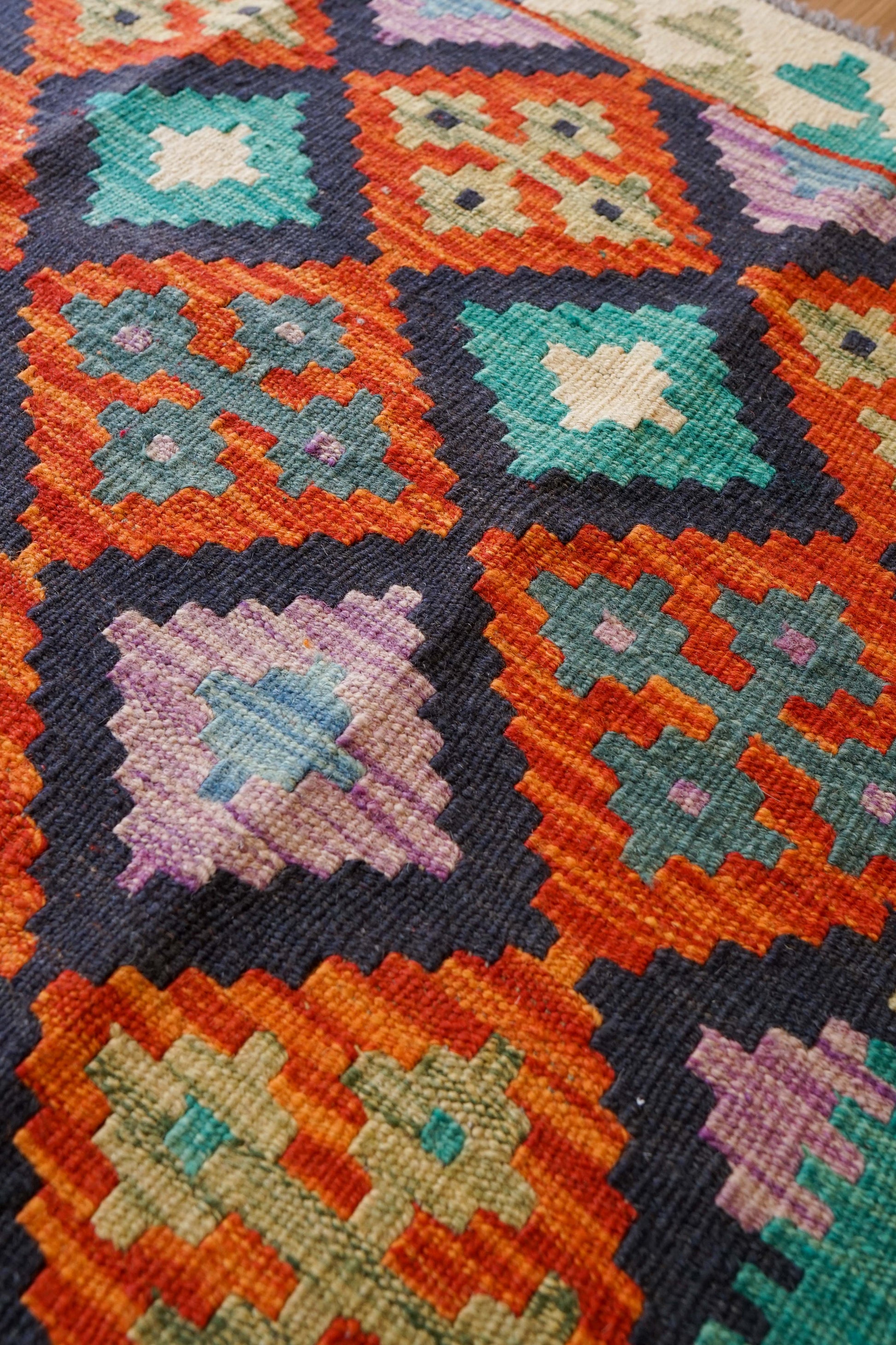 アフガニスタン中央の山間部で生活する少数民族のマイマナ族によって織られたキリム。キリムとは、トルコ、イラン、アフガニスタンを主な産地とする毛足のない平織りの絨毯で、汚れれば水洗いをし、破れれば修理をしたり袋物に作り変えたりと現地では大切に使われています。