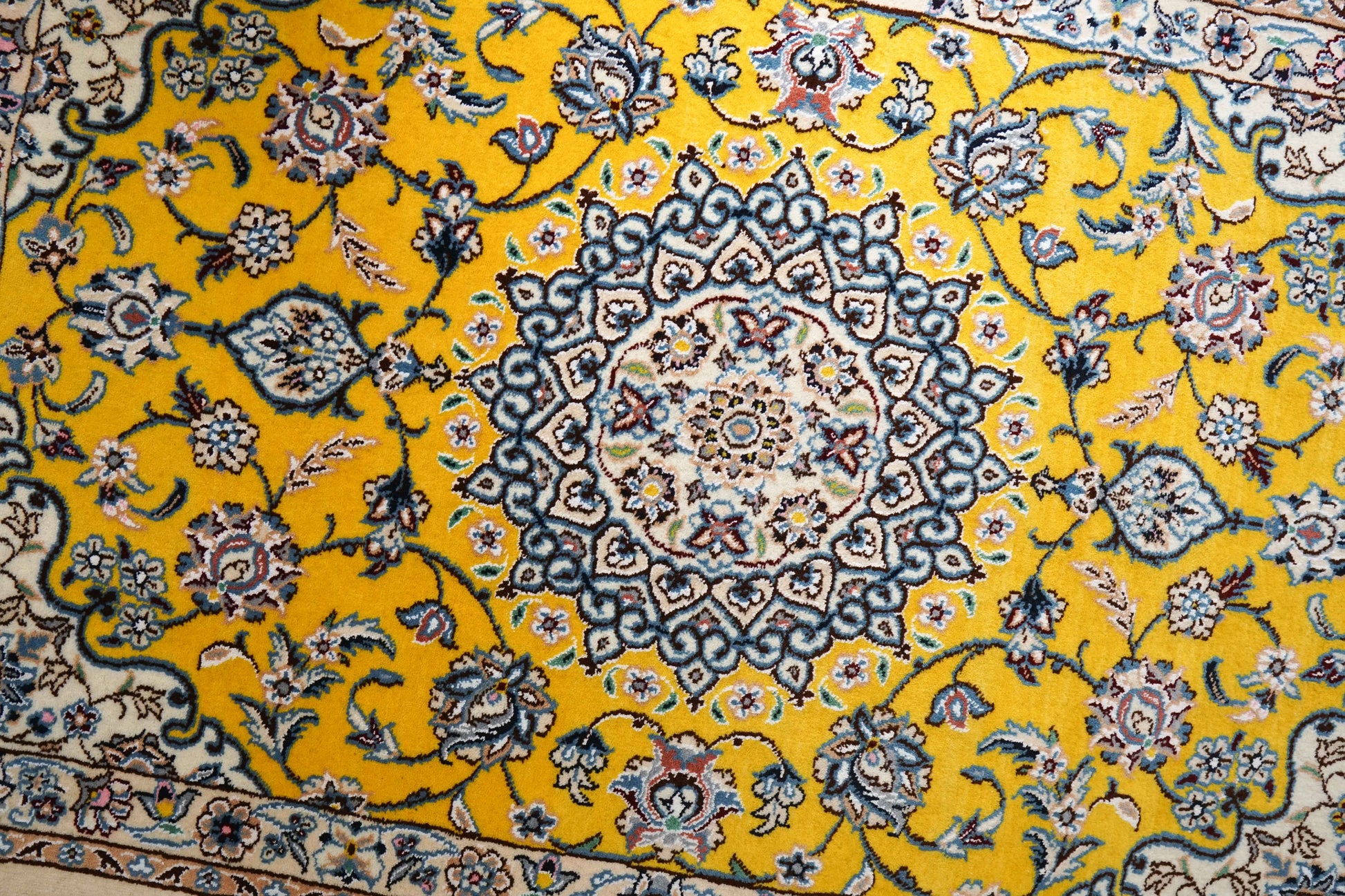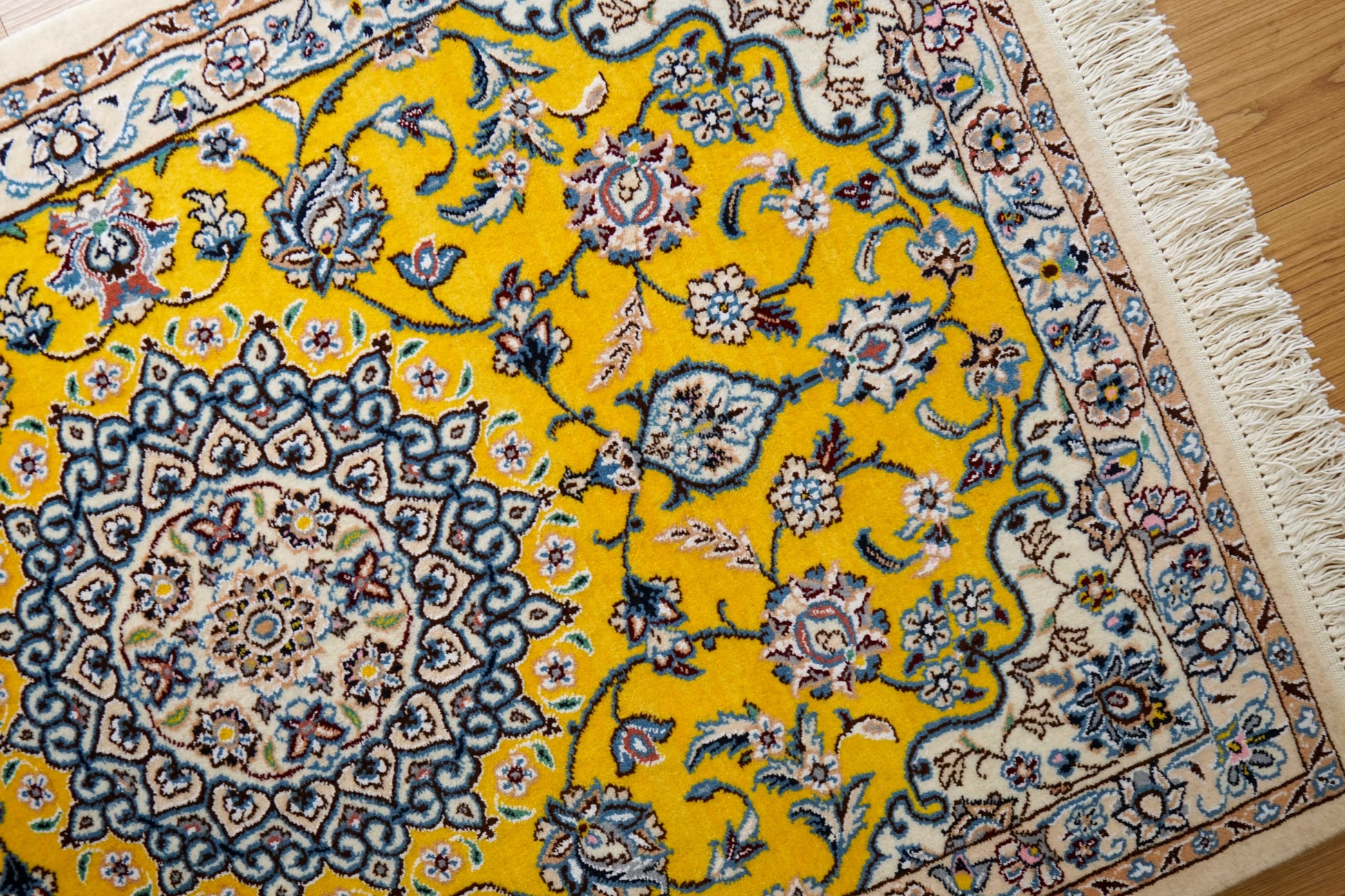 人気のメダリオン(モスクの天井モチーフ)柄と鮮やかなイエローカラーを合わせた華やかな印象。細部の柄まで鮮明で、ペルシャの高い織り技術が光った作品です。