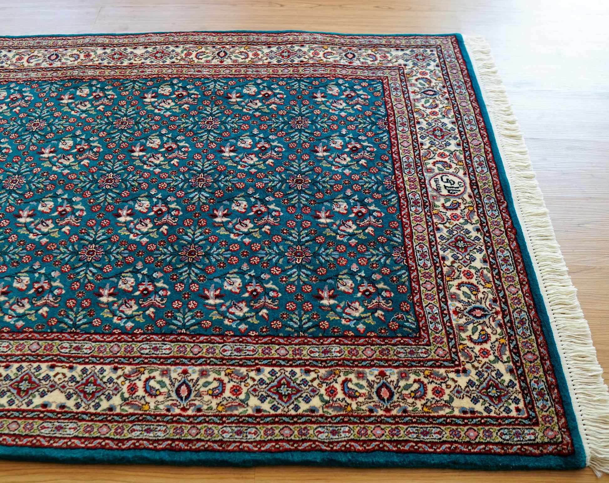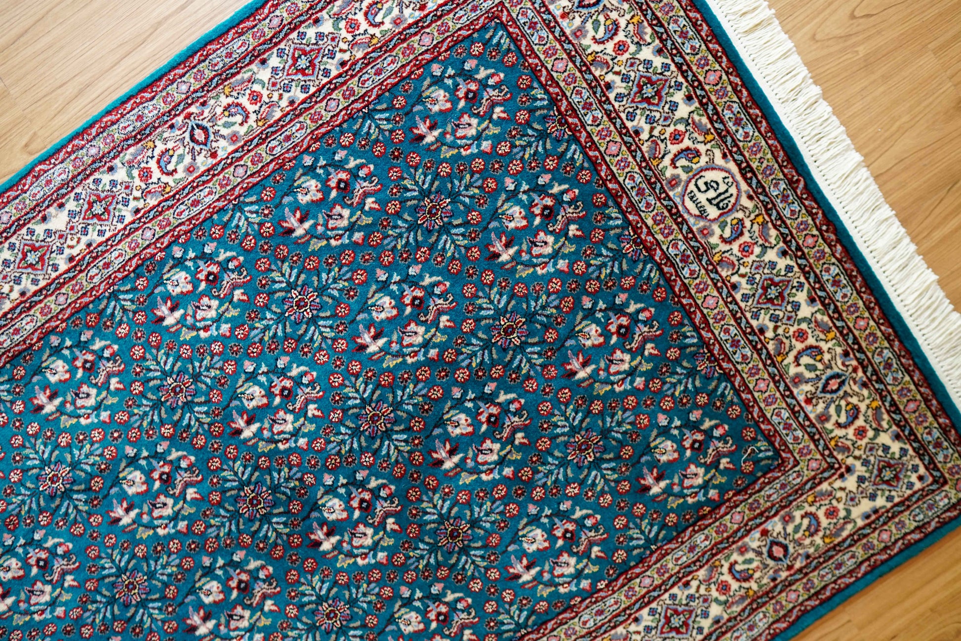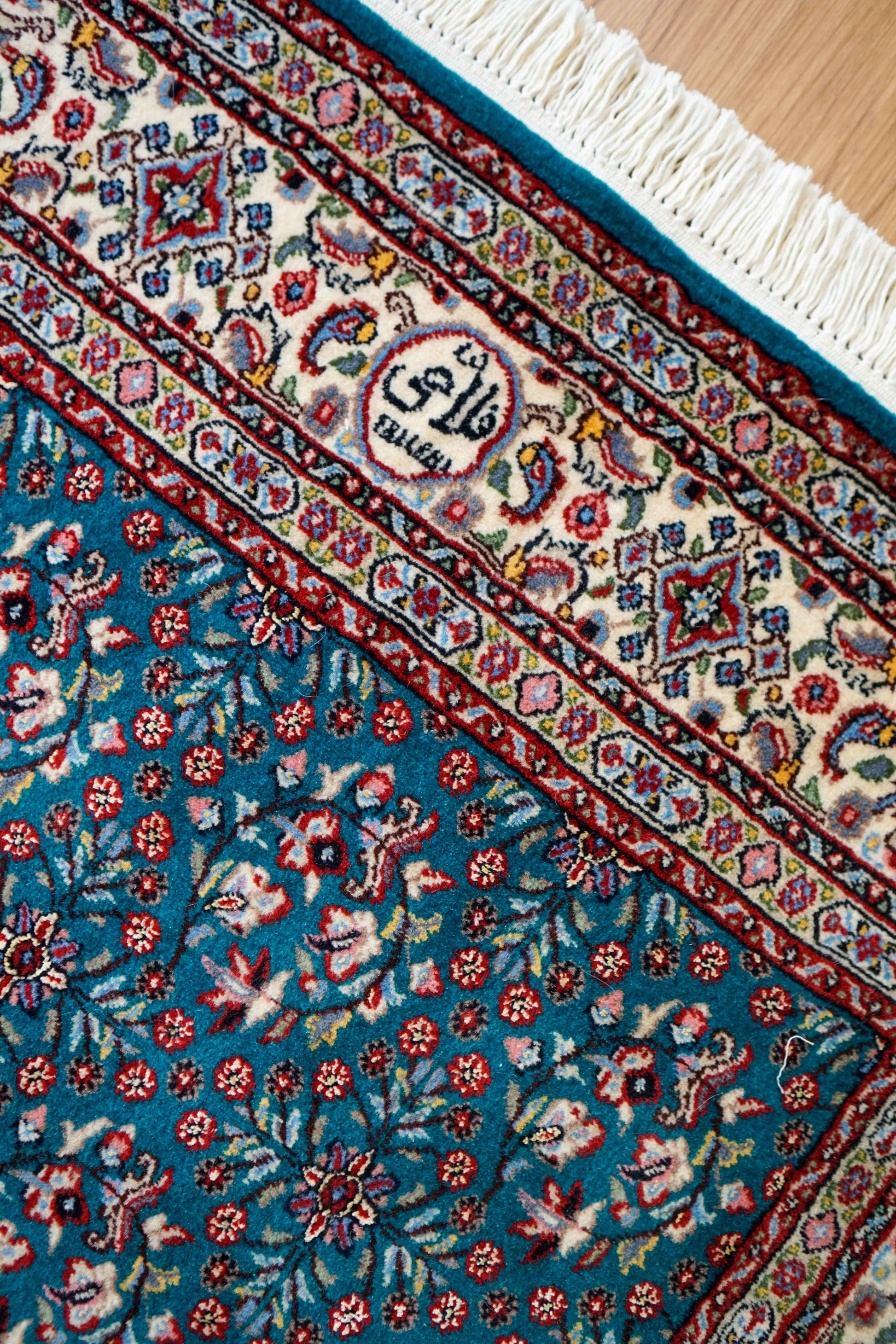 上質なウールを使用したペルシャムード産の手織り絨毯。ムードはペルシャ絨毯の歴史が長く、何世紀にもわたりその伝統を継承しています。