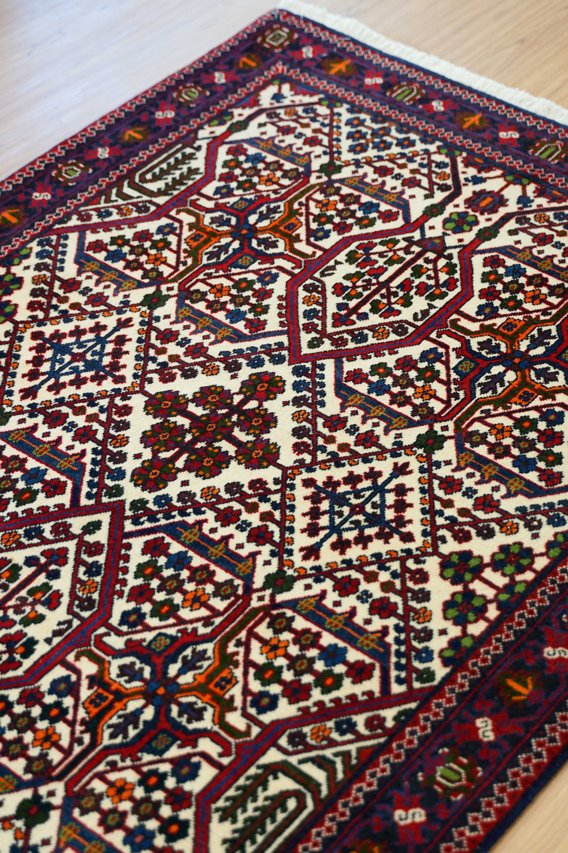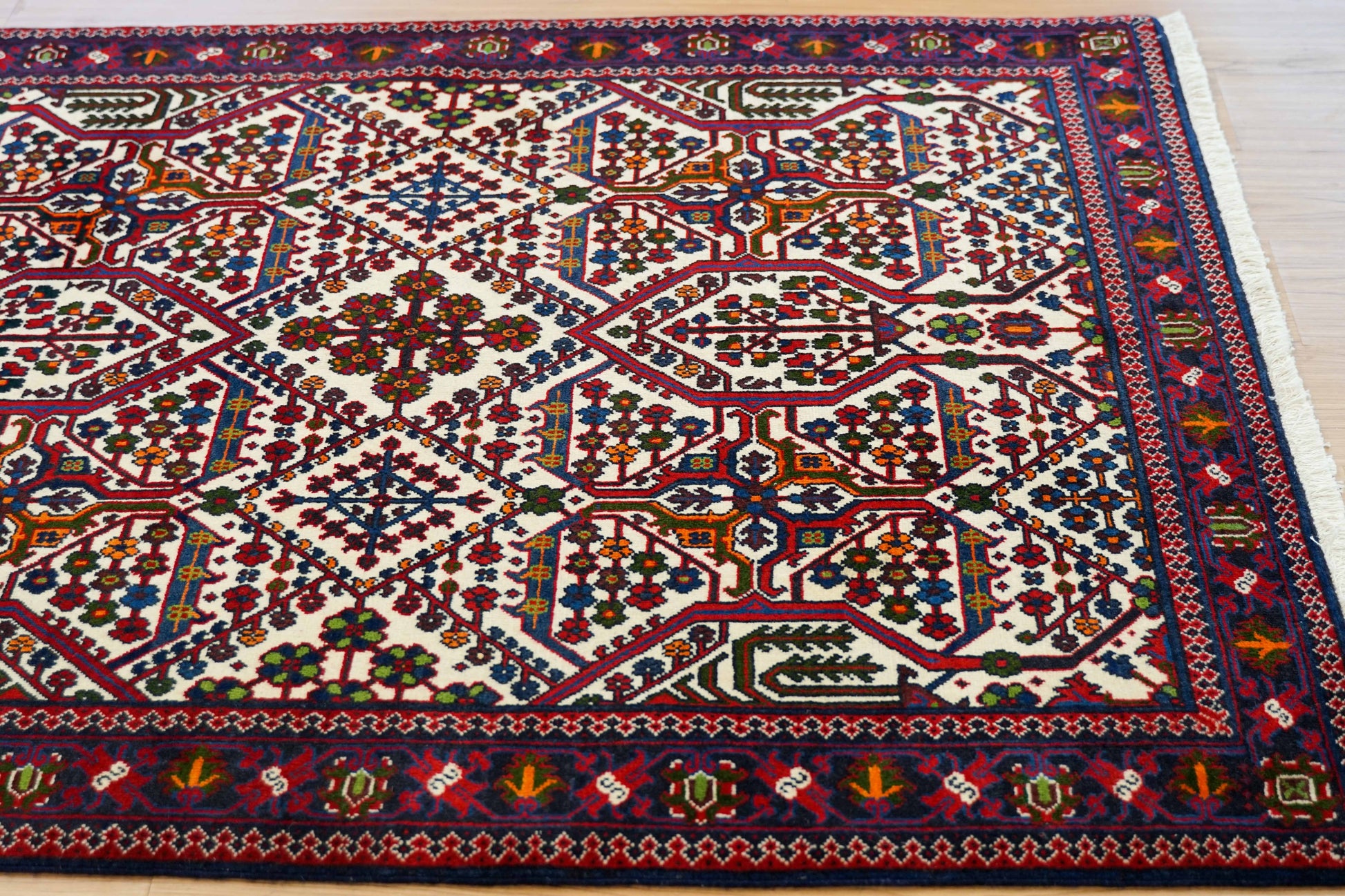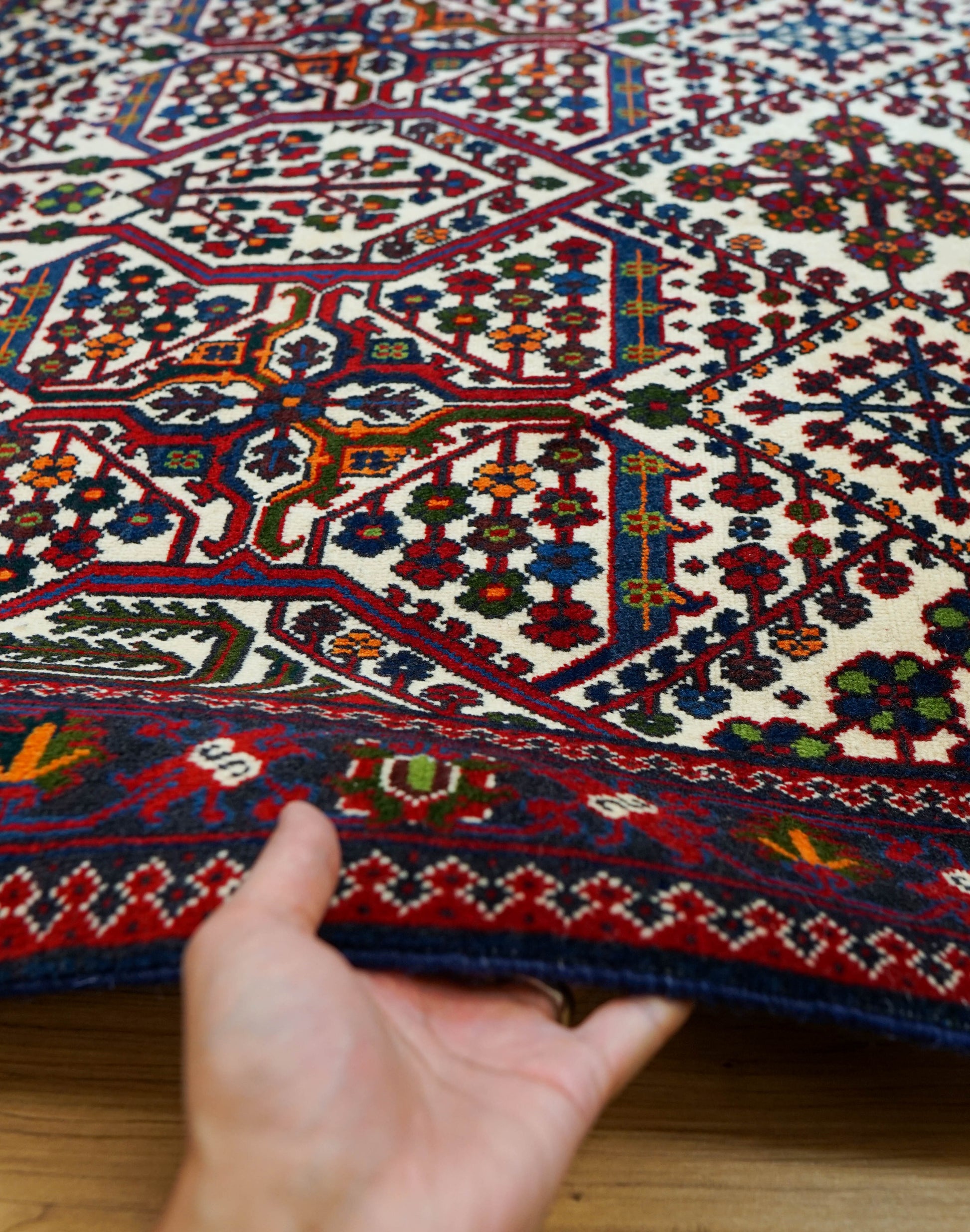 アイボリーの明るいベースに、赤とネイビーを中心とした幾何学模様が丁寧に織り込まれています。繰り返し現れる生命の木のようなモチーフには、成長や繁栄への願いが込められています。