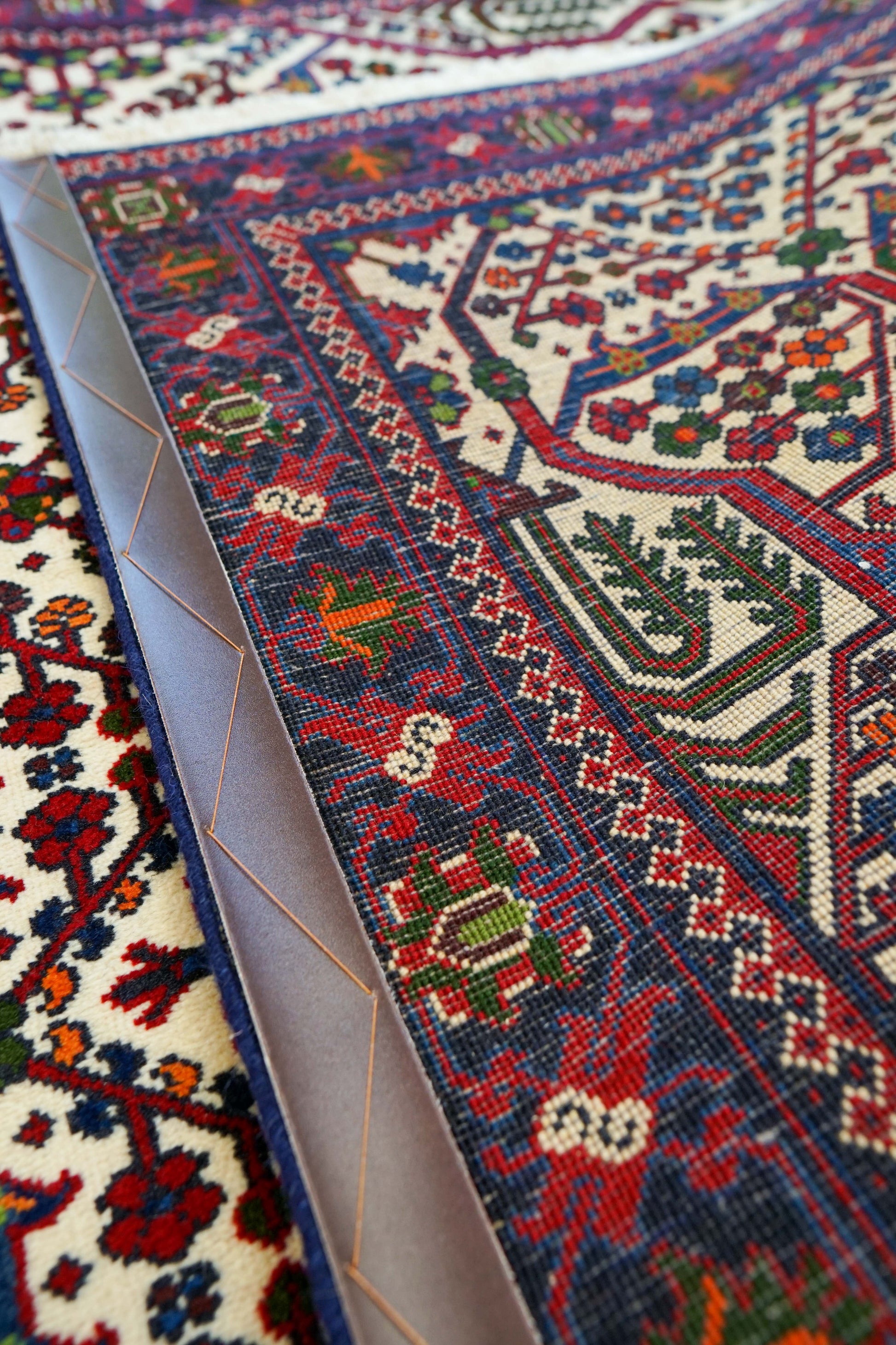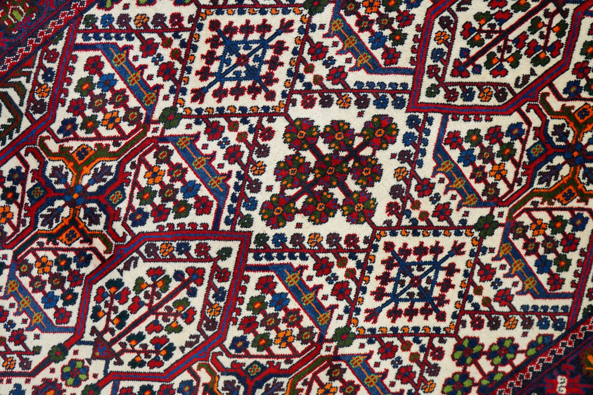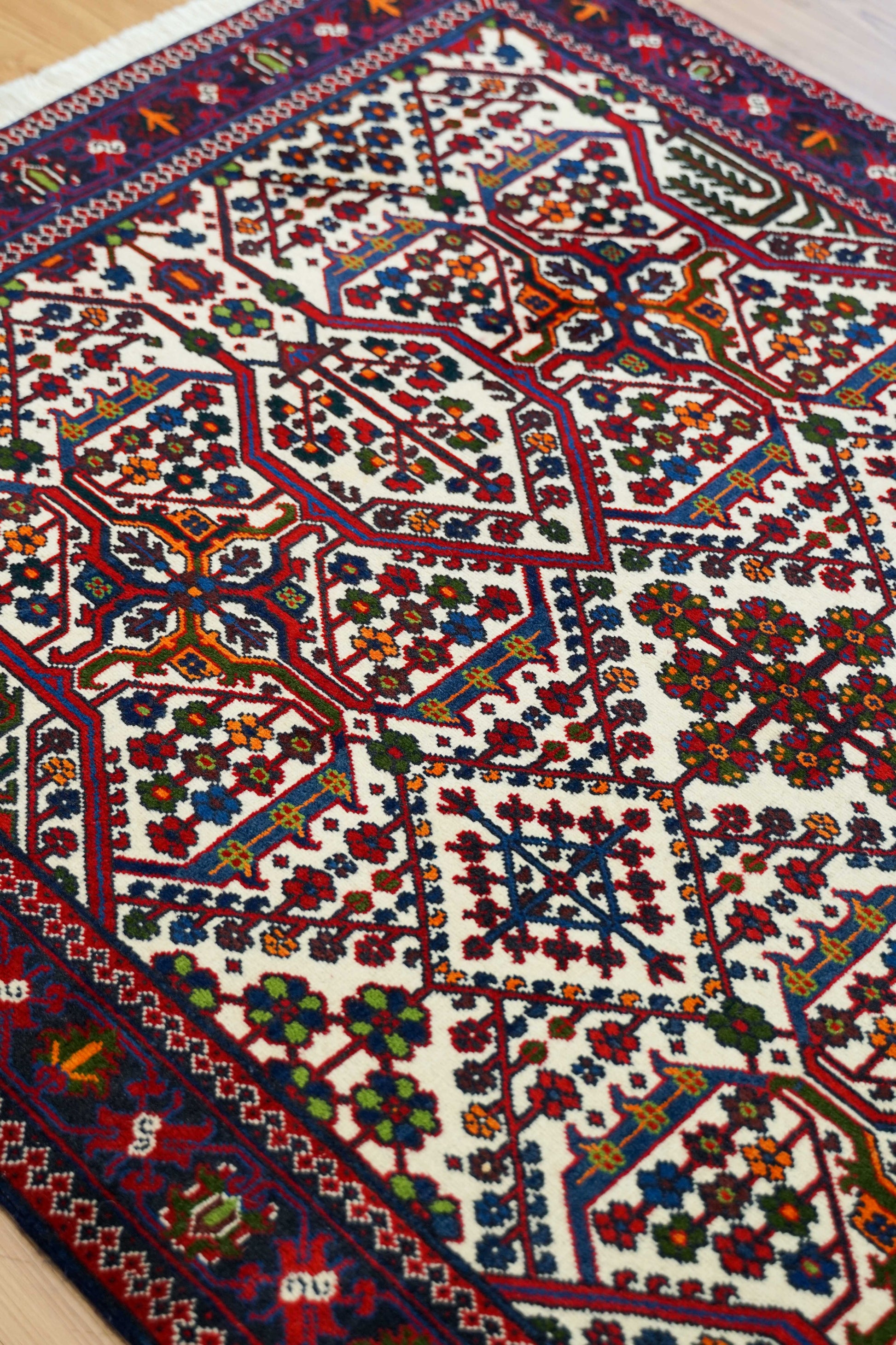 アイボリーの明るいベースに、赤とネイビーを中心とした幾何学模様が丁寧に織り込まれています。繰り返し現れる生命の木のようなモチーフには、成長や繁栄への願いが込められています。