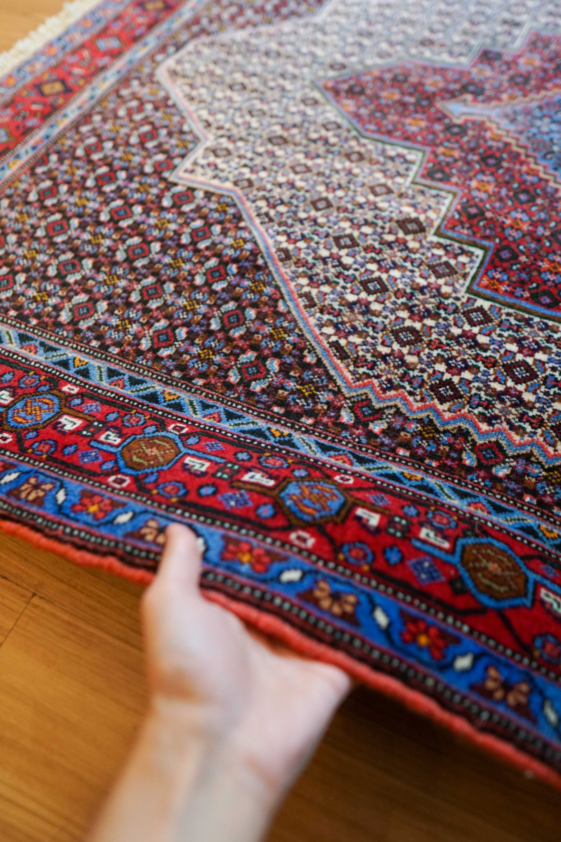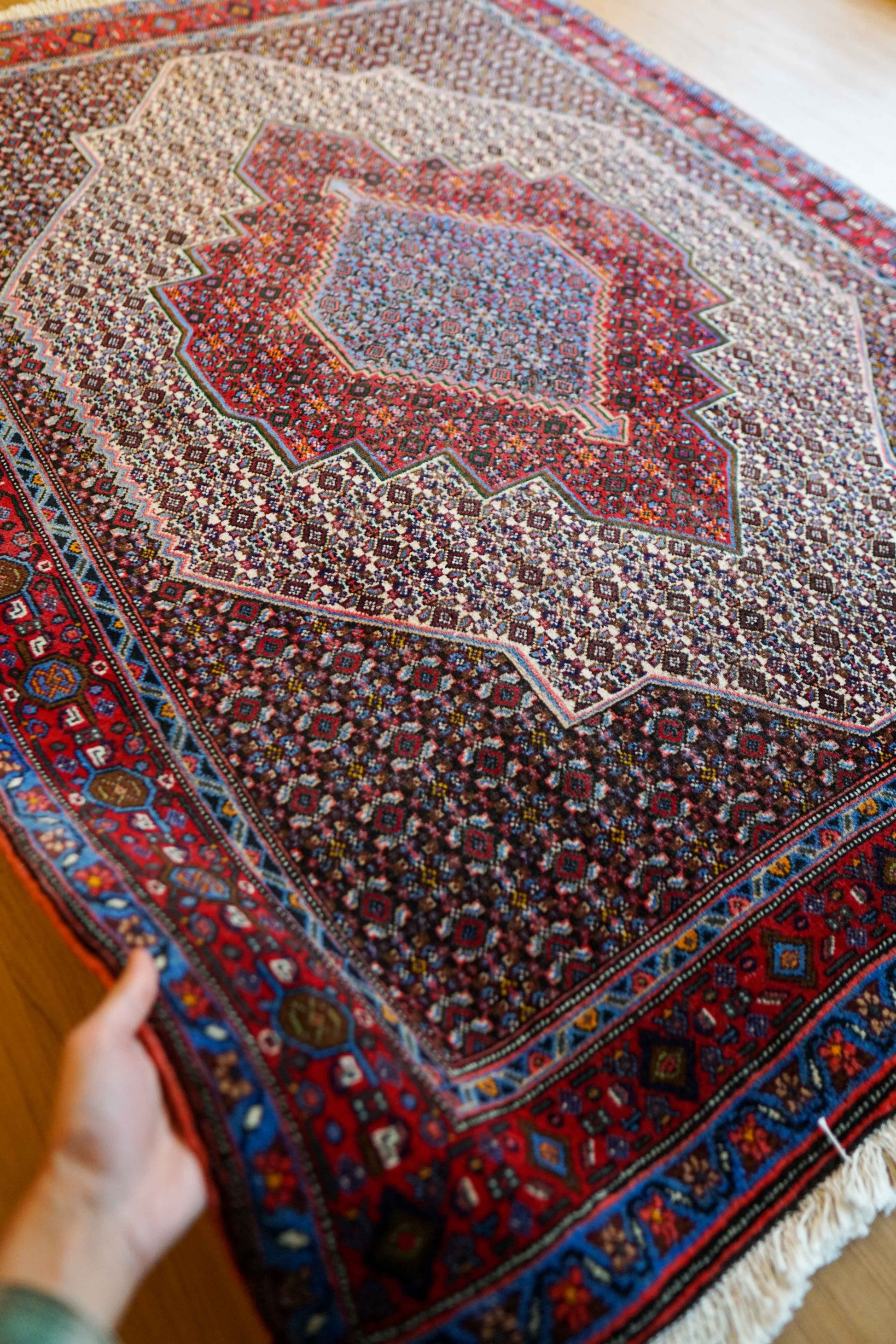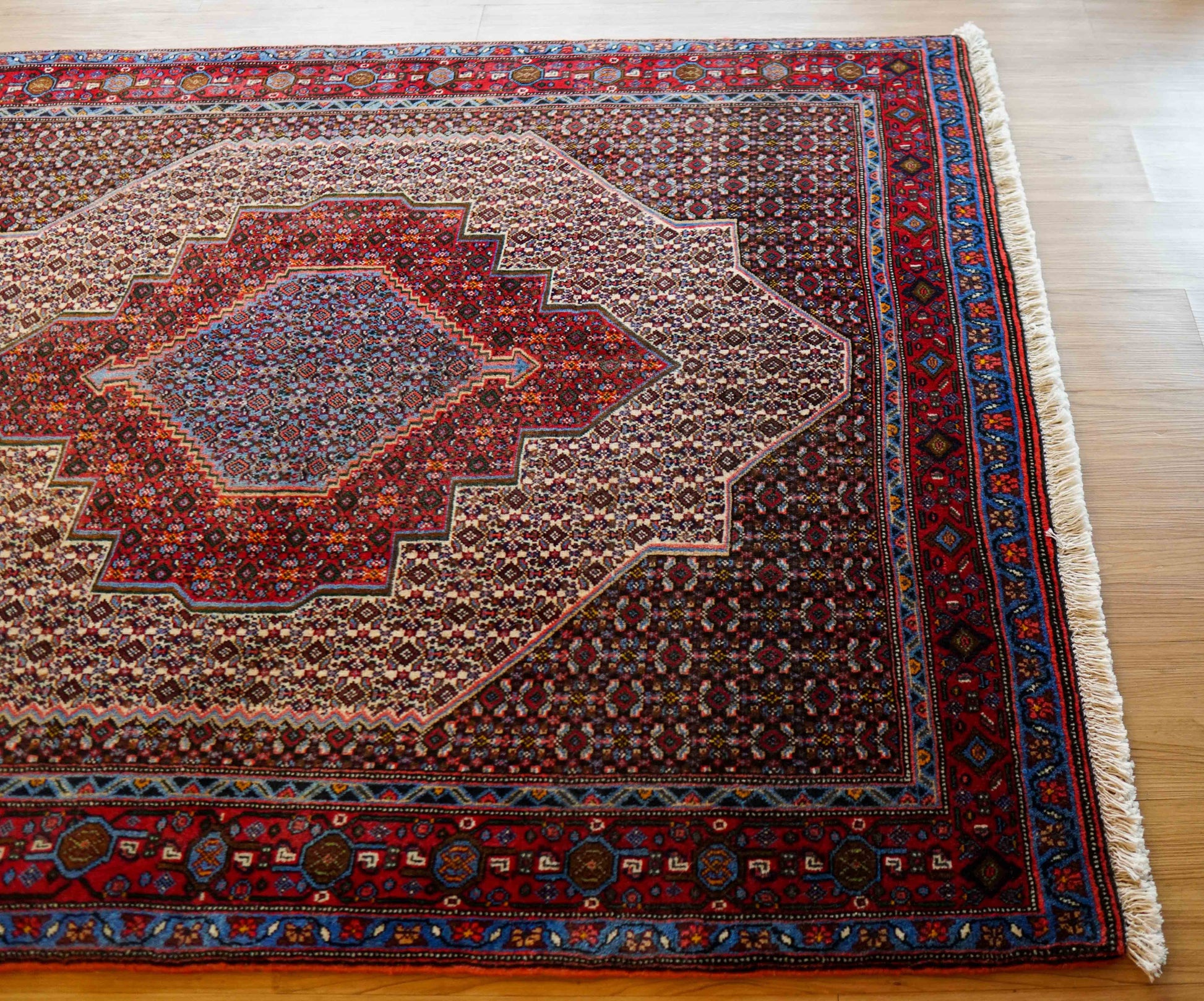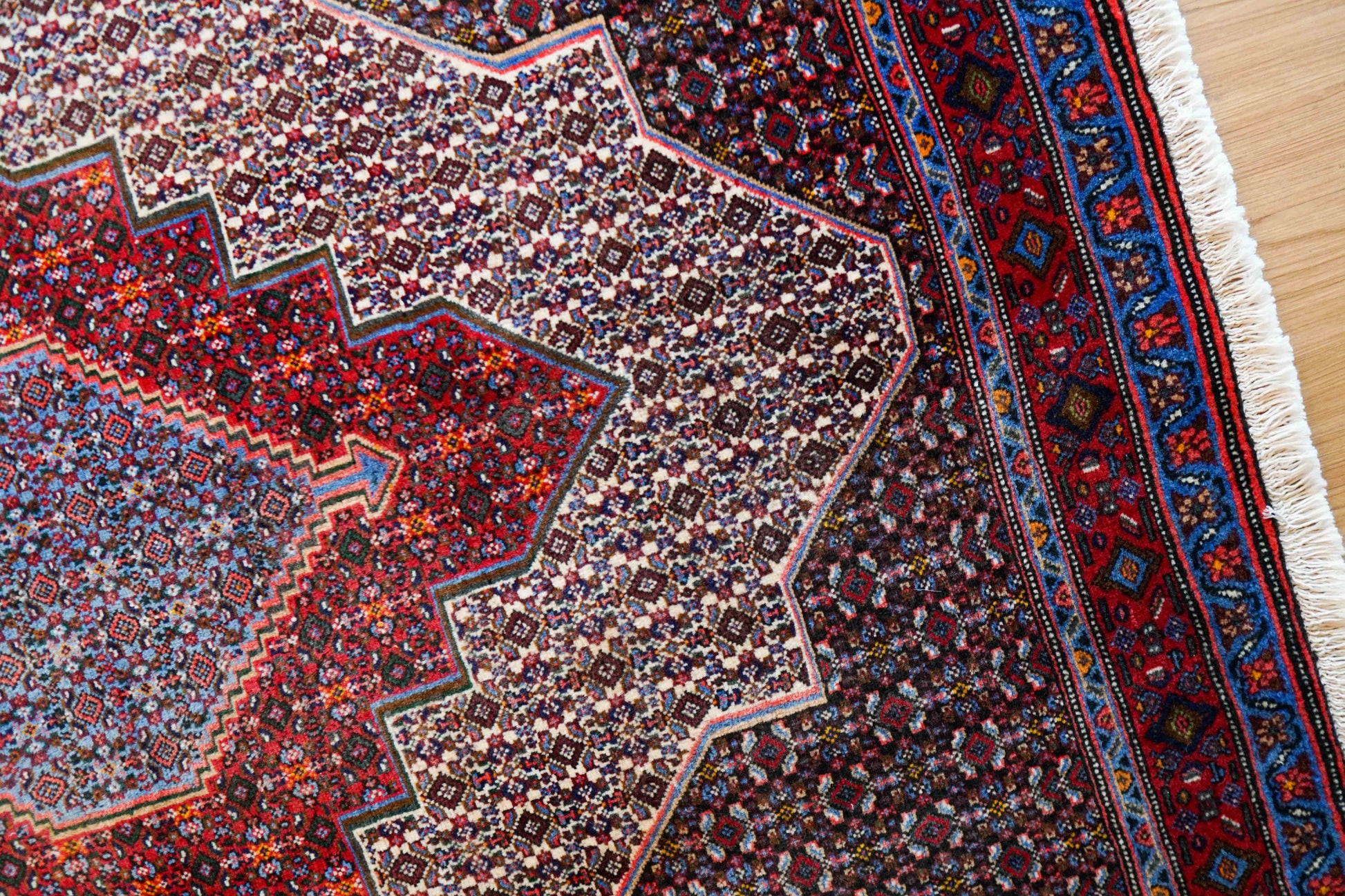 こちらはイラン西部、クルディスタン地方の中心都市セネンダジ(サナンダジ)で織られたペルシャ絨毯です。細かな幾何学文様が一面に広がり、中央の大きなメダリオンが力強い印象を与える、伝統的で存在感のある一枚です。