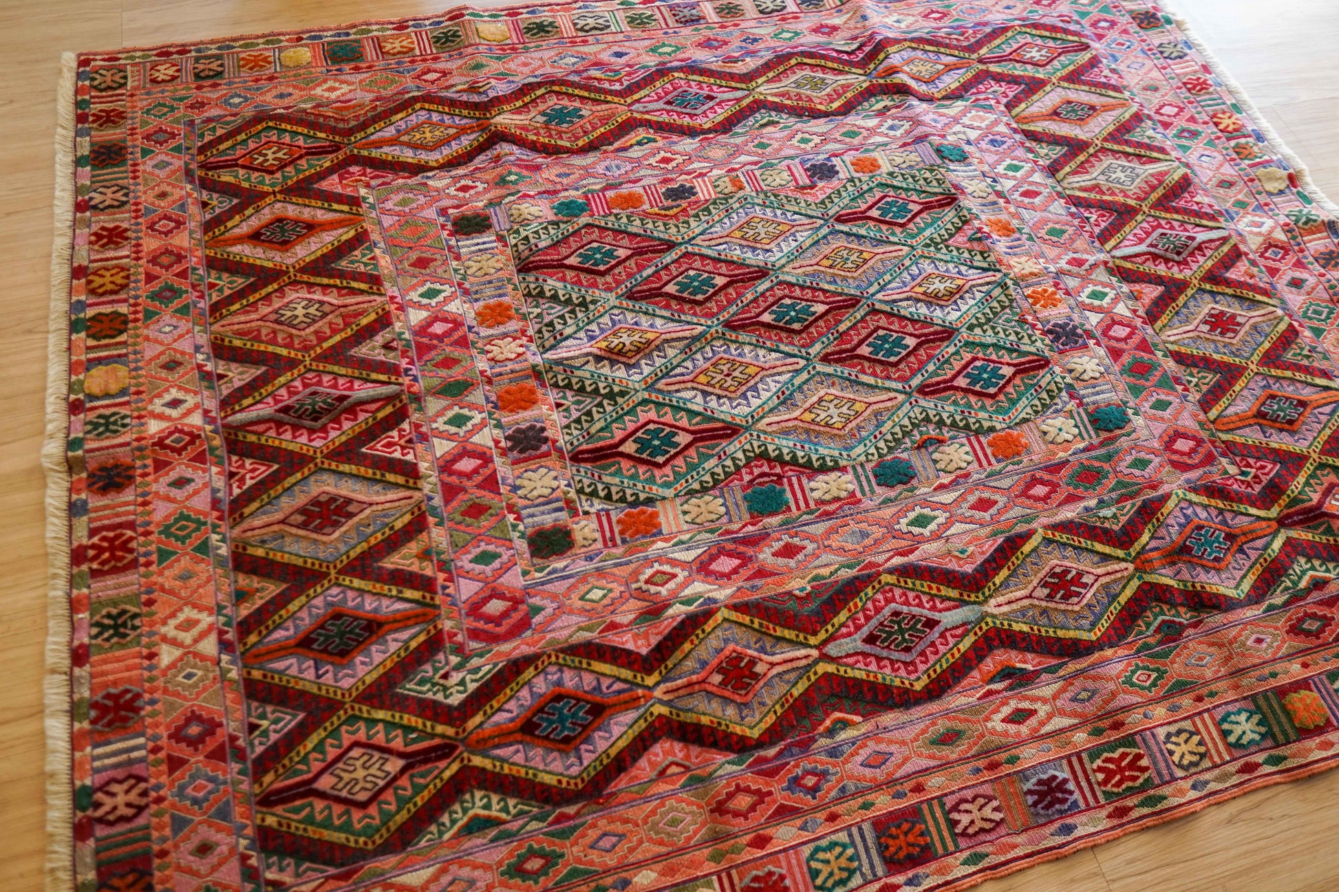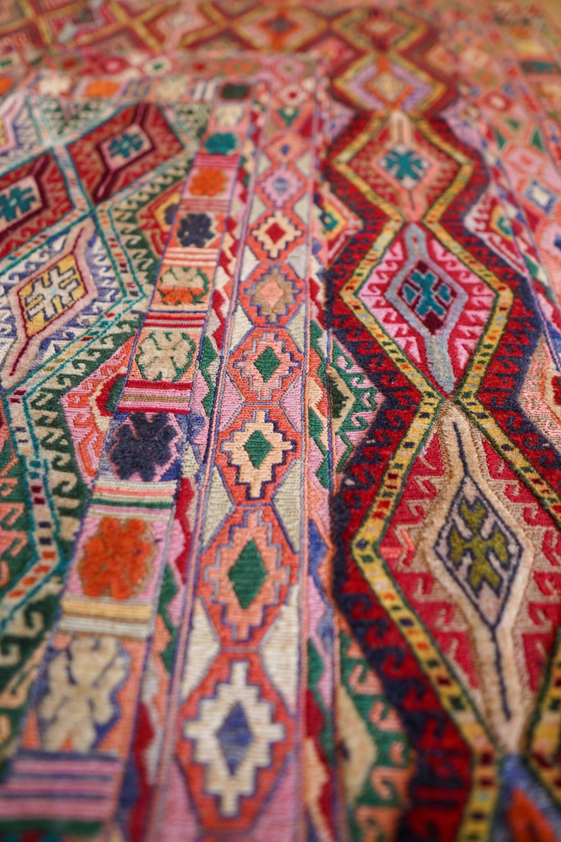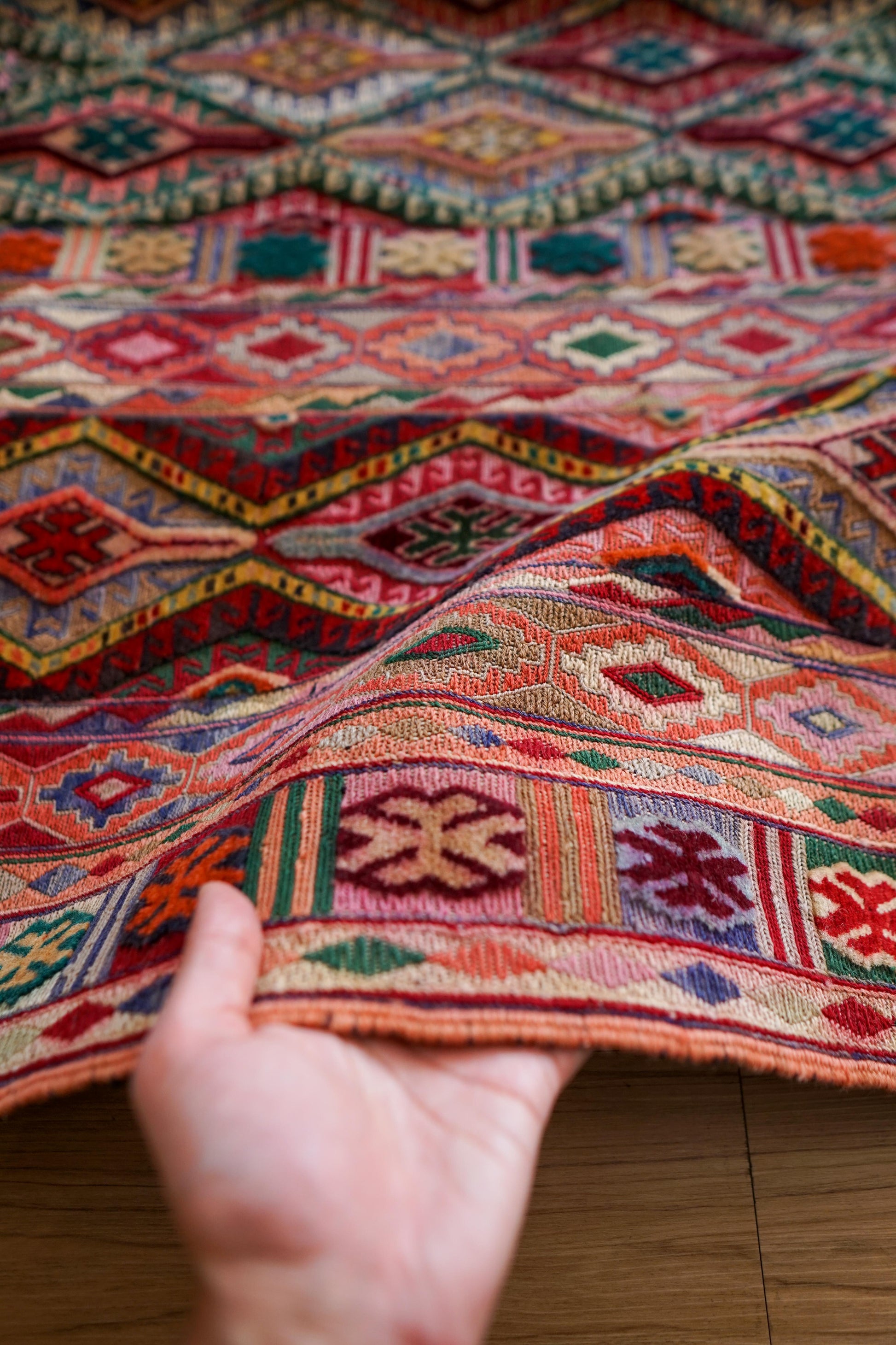 アフガニスタン ヘラート産のマシュワニキリムです。マシュワニ族という部族が手織りしています。彼らの得意とするスマック織りという技法は、複雑な織り技術を要するため難易度が高く、希少で日本ではあまり出回っていません。