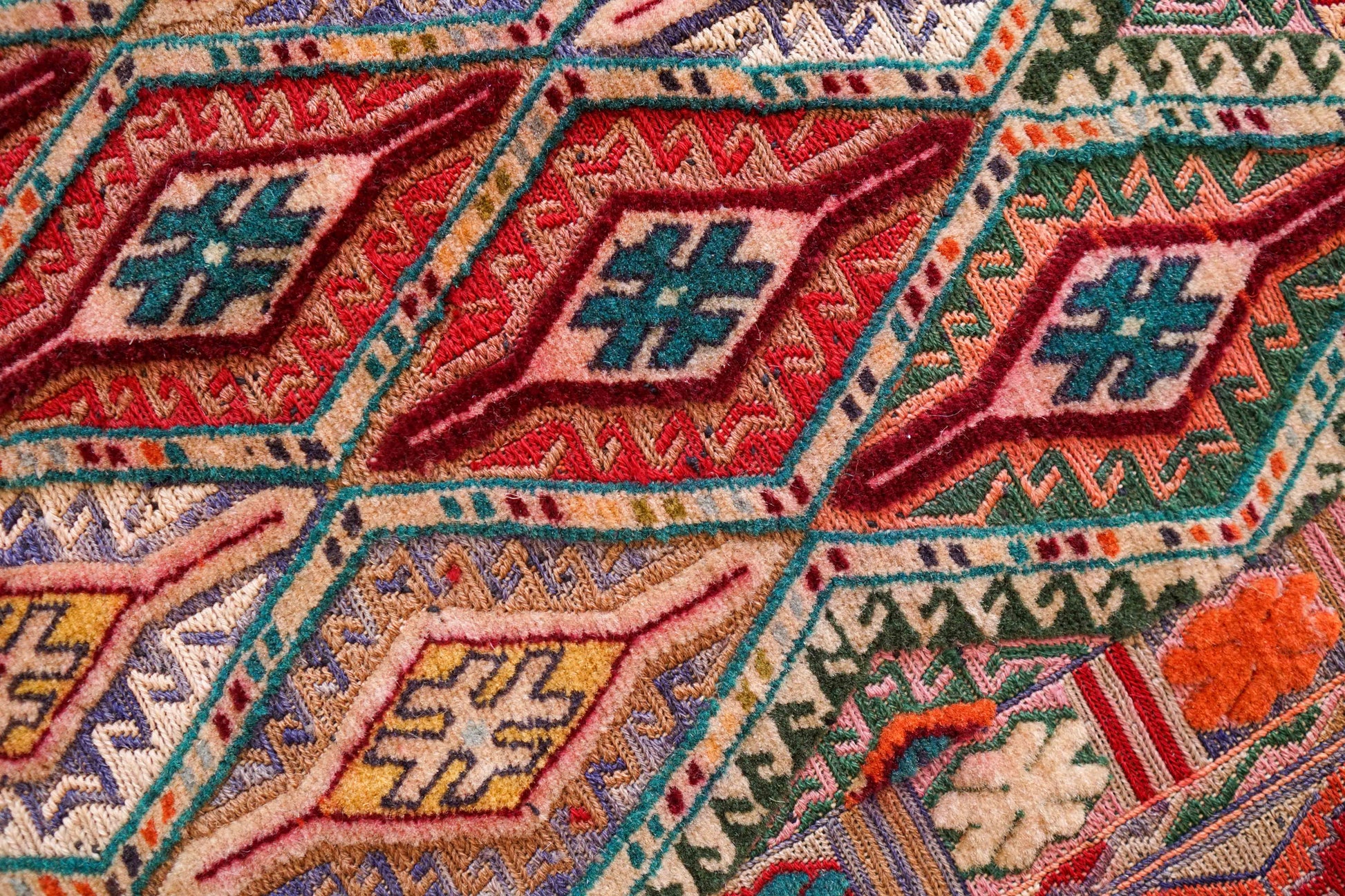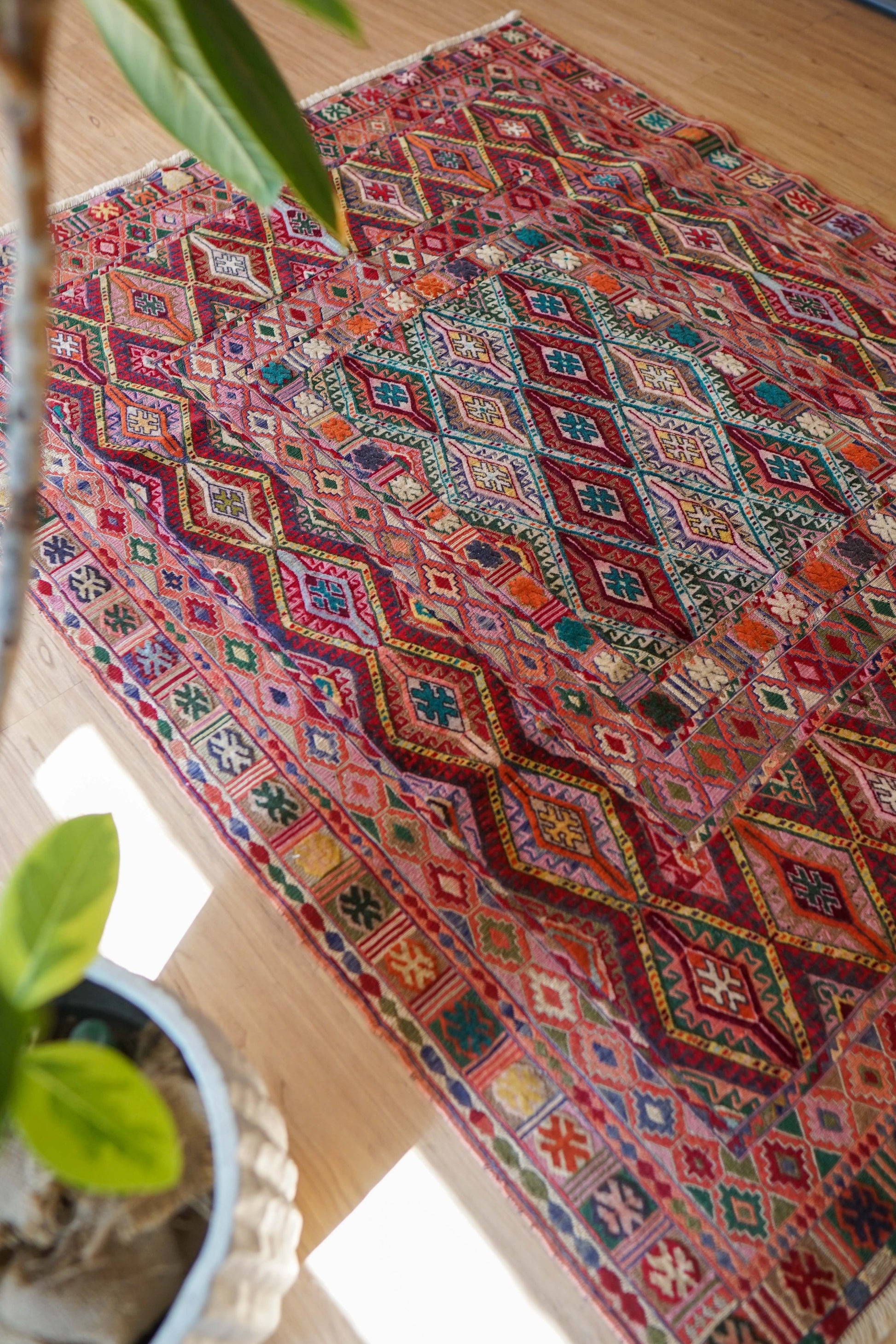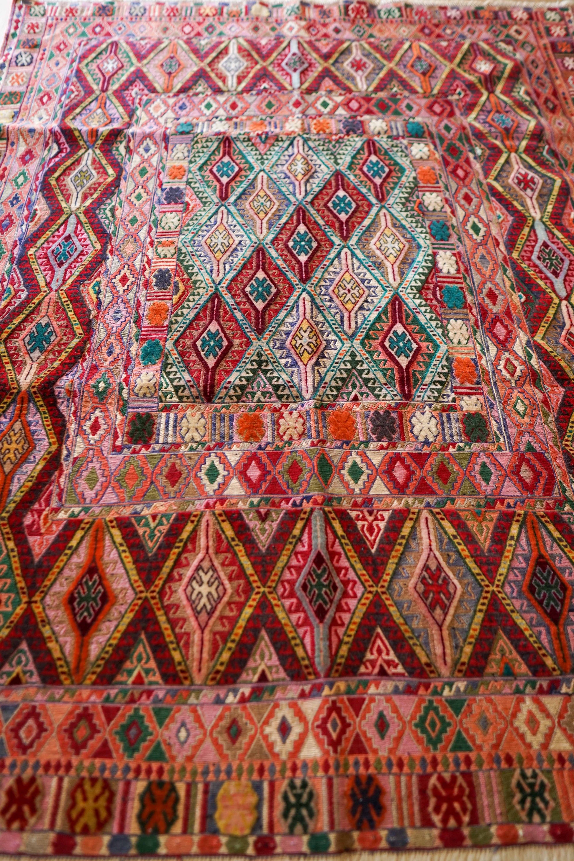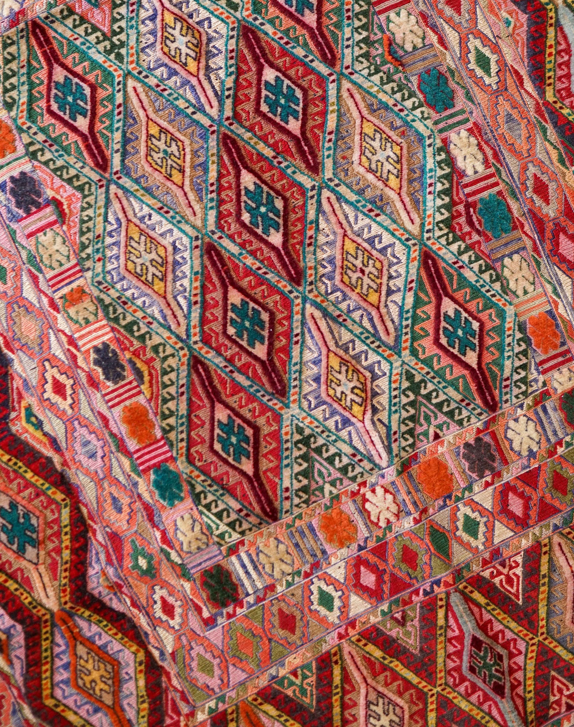 アフガニスタン ヘラート産のマシュワニキリムです。マシュワニ族という部族が手織りしています。彼らの得意とするスマック織りという技法は、複雑な織り技術を要するため難易度が高く、希少で日本ではあまり出回っていません。