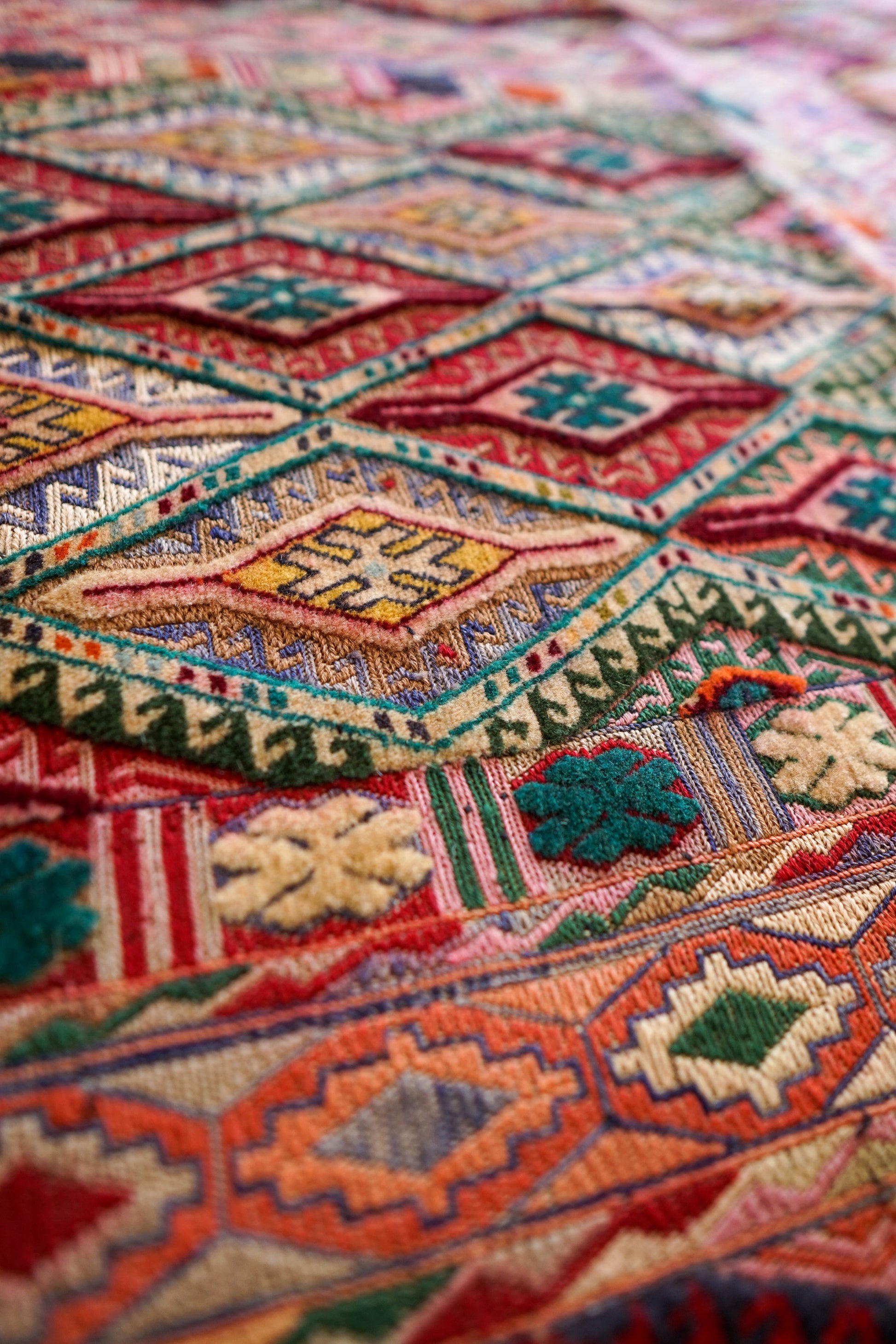 毛足のない麻のような肌触りのキリムと、パイル地の絨毯部分を合わせもった凸凹のある絨毯で、幾何学的なデザインが美しく、踏み心地も大変良いです。