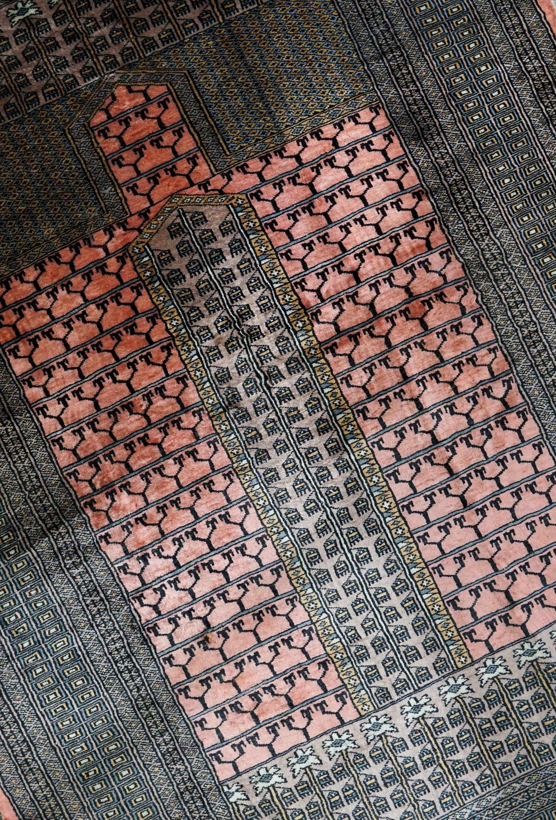 珍しいピンクベースのメヘラーブ柄。メヘラーブとは、イスラムの寺院にあるアーチ状のくぼみのこと。聖地メッカの方角を示す壁の模様。祈祷用のラグには欠かせないモチーフ。