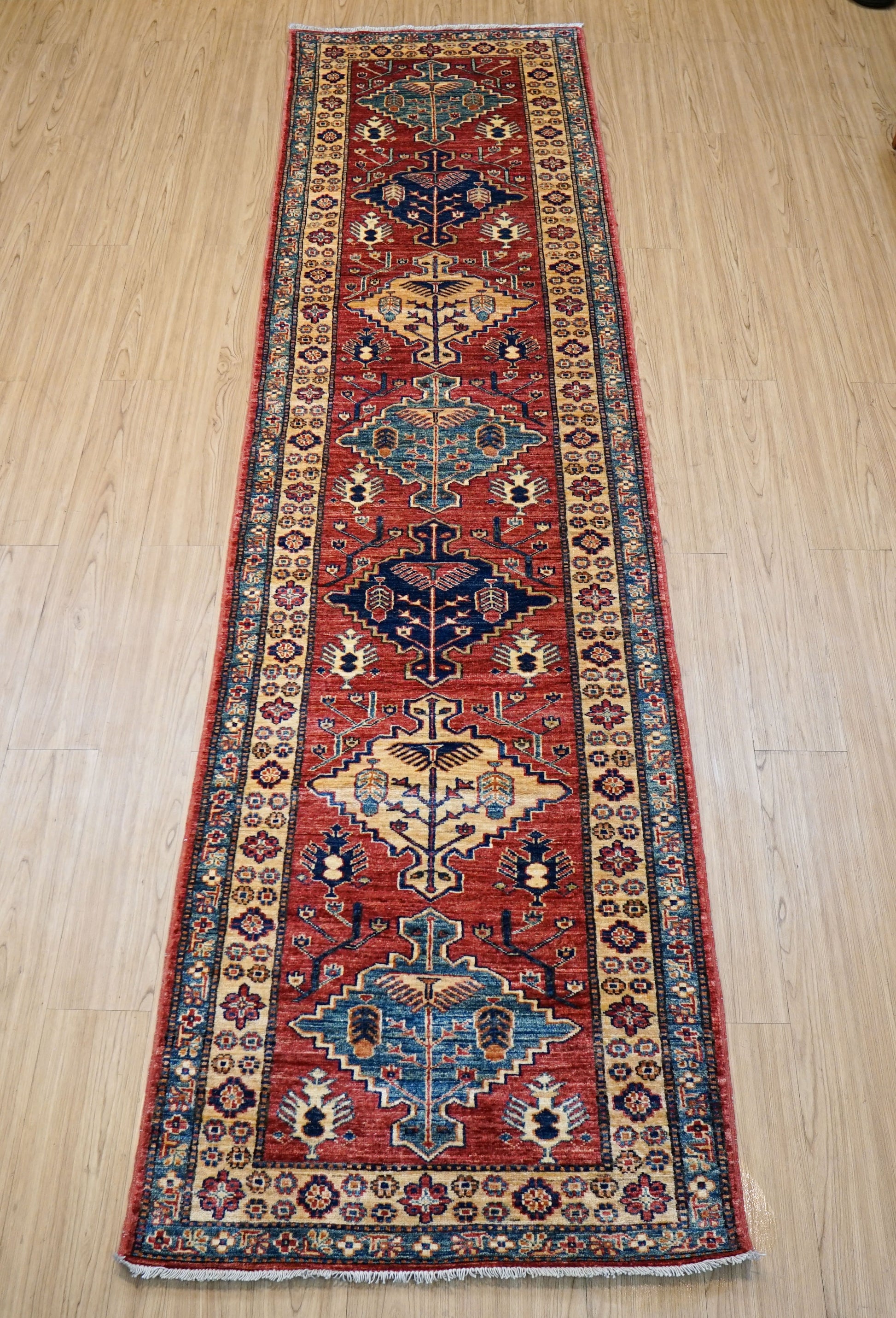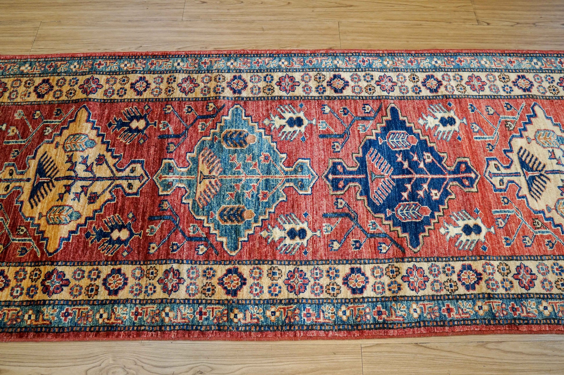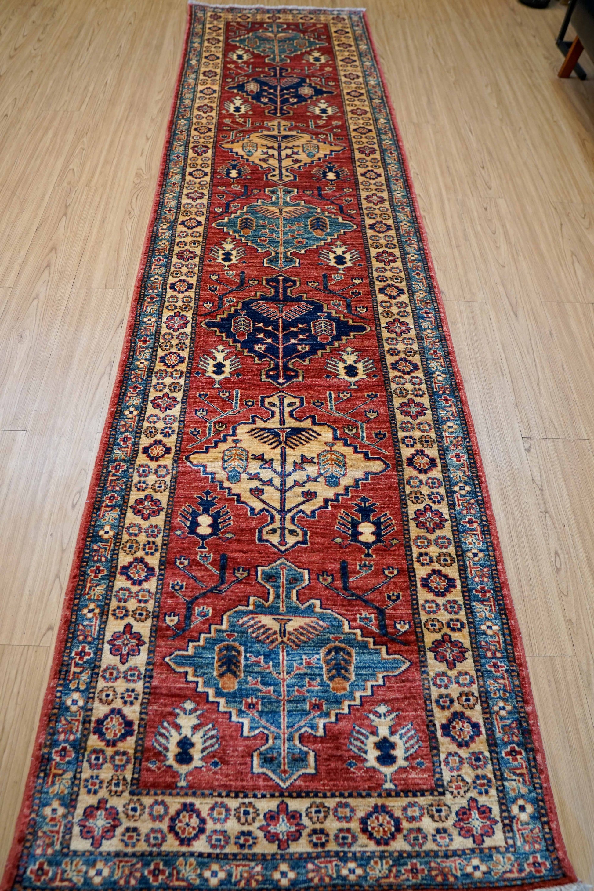 アフガニスタン手織り ガズニウールラグ 317×78cm|カザクデザイン・ロングランナー|赤×ブルー