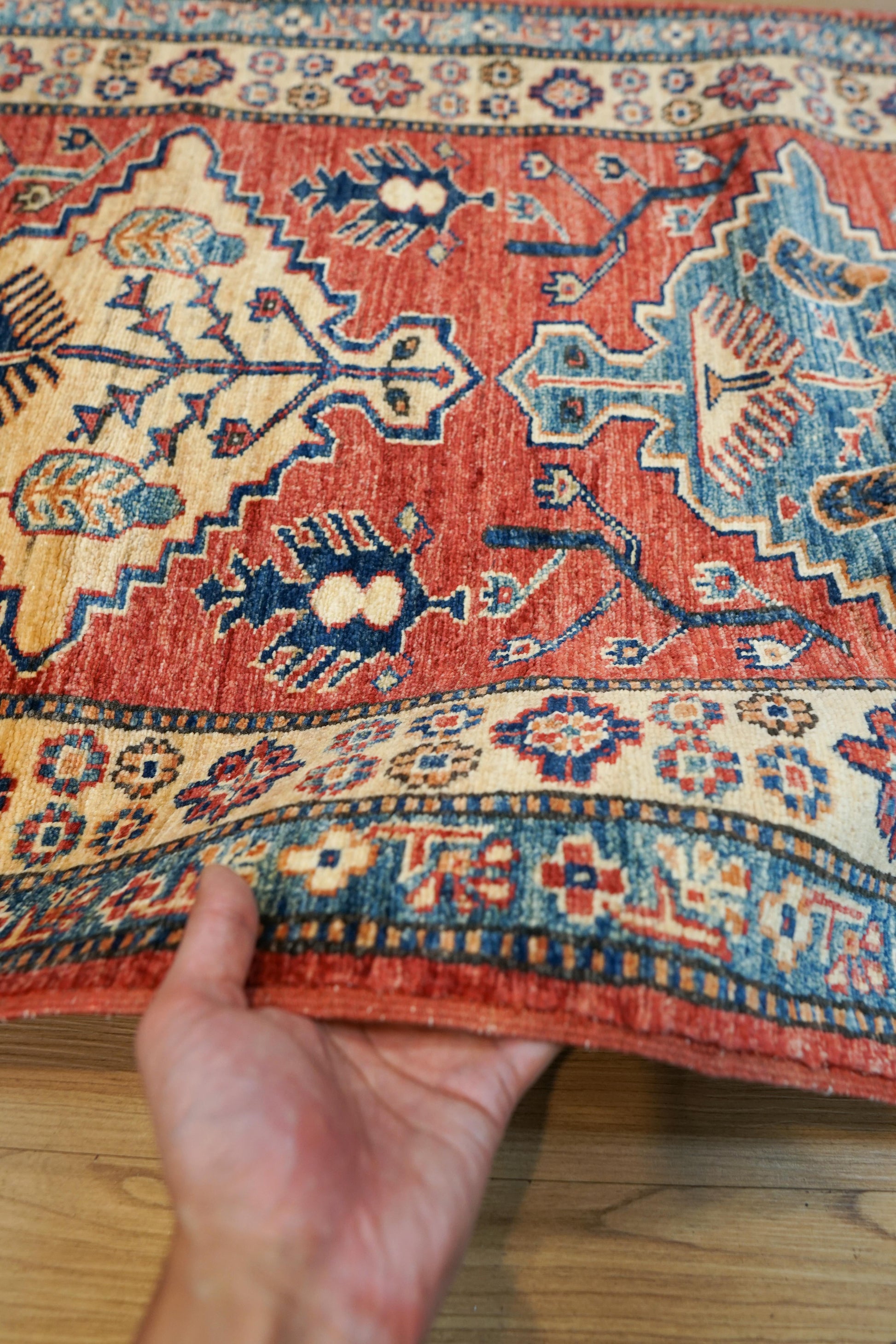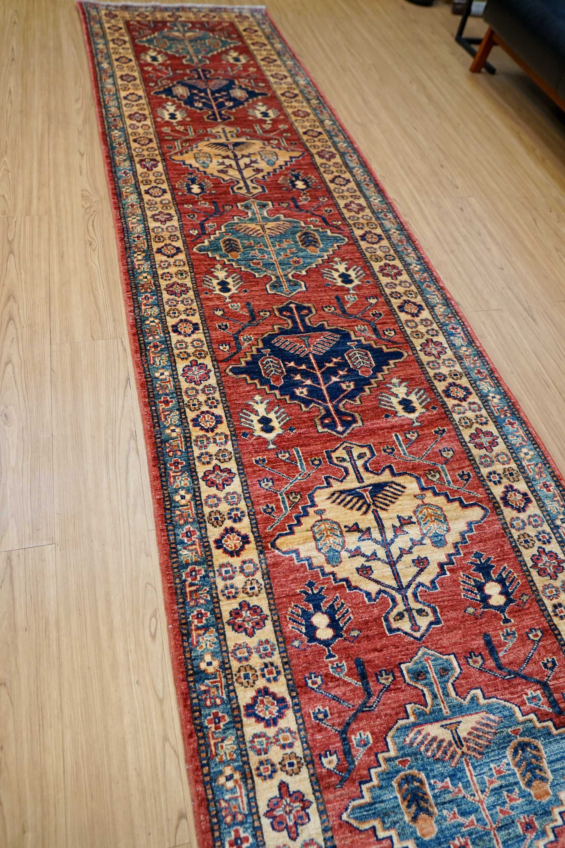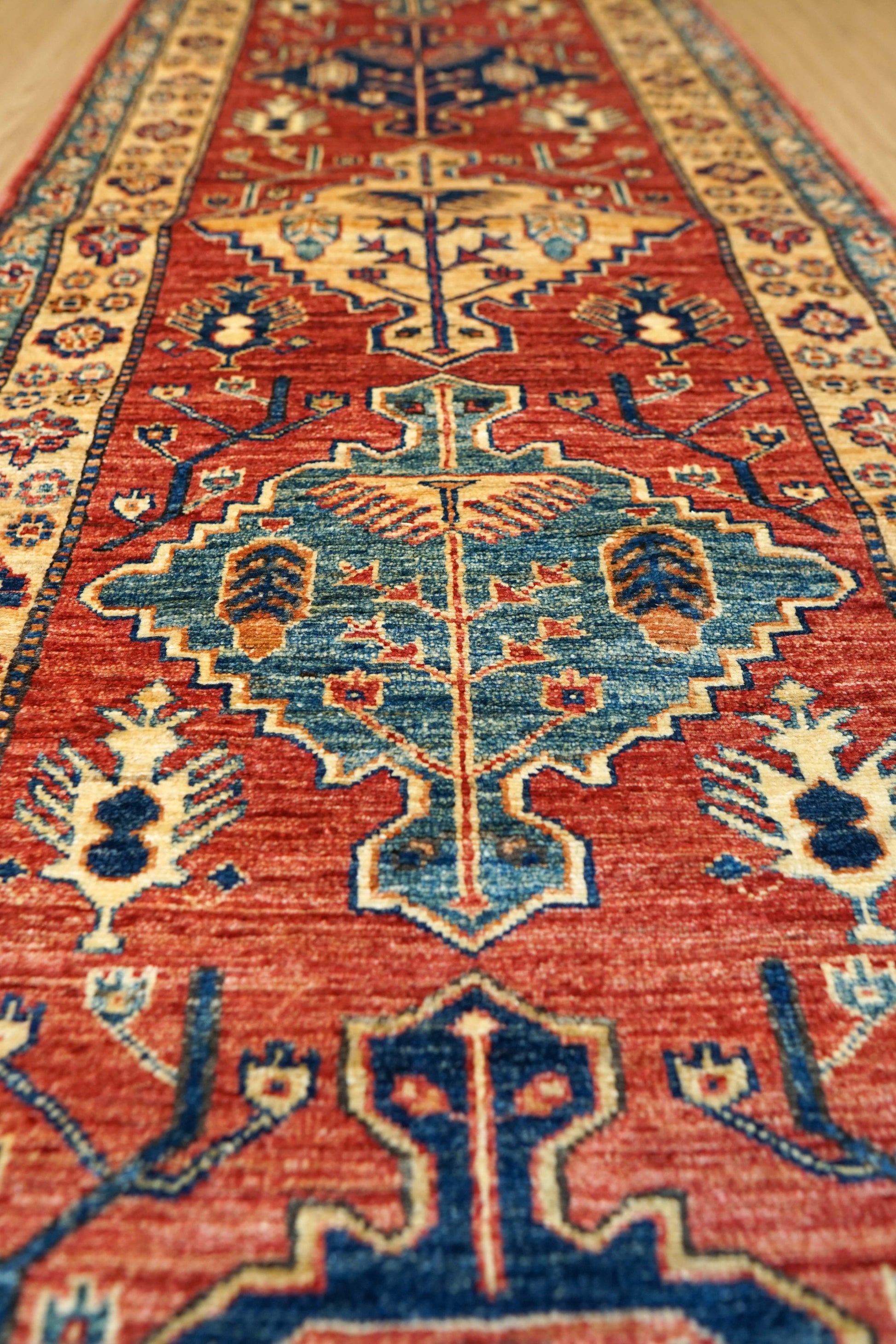アフガニスタン手織り ガズニウールラグ 317×78cm|カザクデザイン・ロングランナー|赤×ブルー