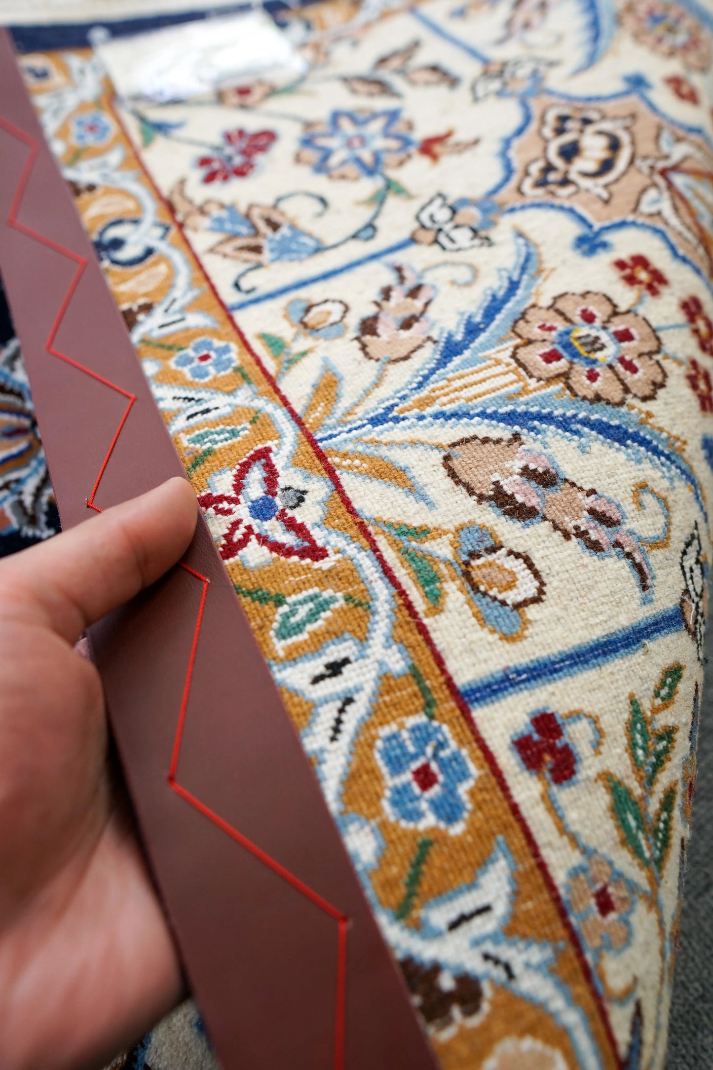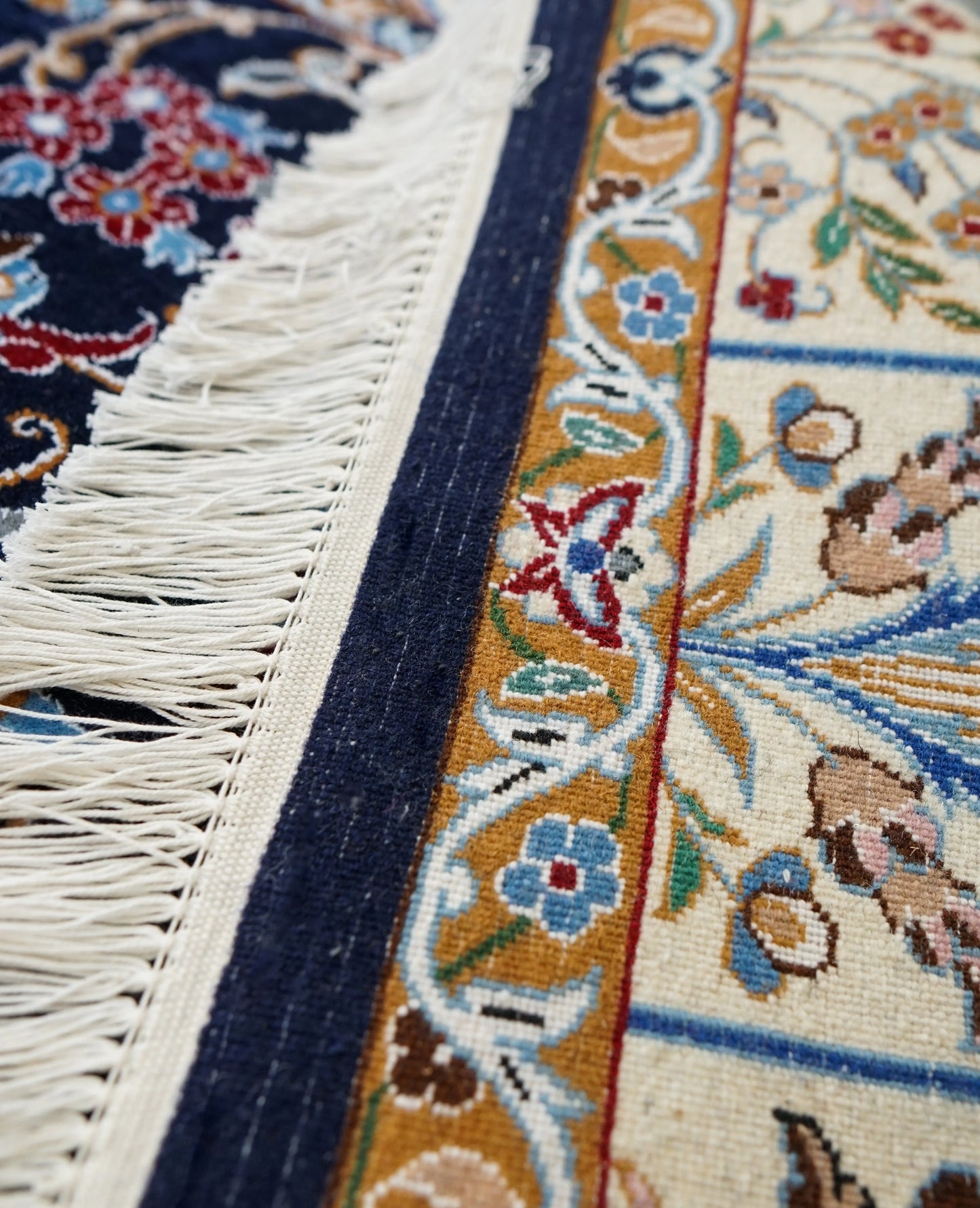 ペルシャ ナイン産の手織り絨毯。生まれて1年以内の子羊から刈り取った貴重なコールクウールで織り上げた大変柔らかい絨毯です。手織り絨毯の特性でもある、毛流れの向きによって色味が異なって見える面白さも存分に味わえる仕上がりになっています。