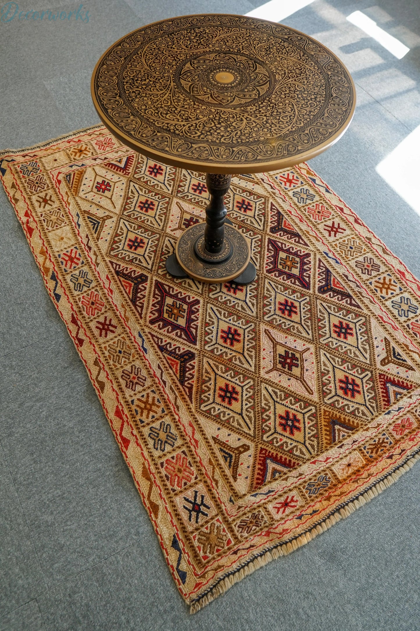 アフガニスタン ヘラート産のマシュワニキリムです。マシュワニ族という部族が手織りしています。彼らの得意とするスマック織りという技法は、複雑な織り技術を要するため難易度が高く、希少で日本ではあまり出回っていません。