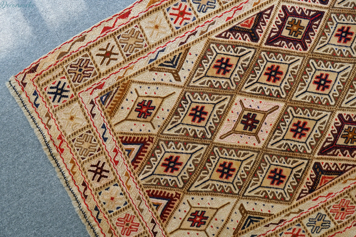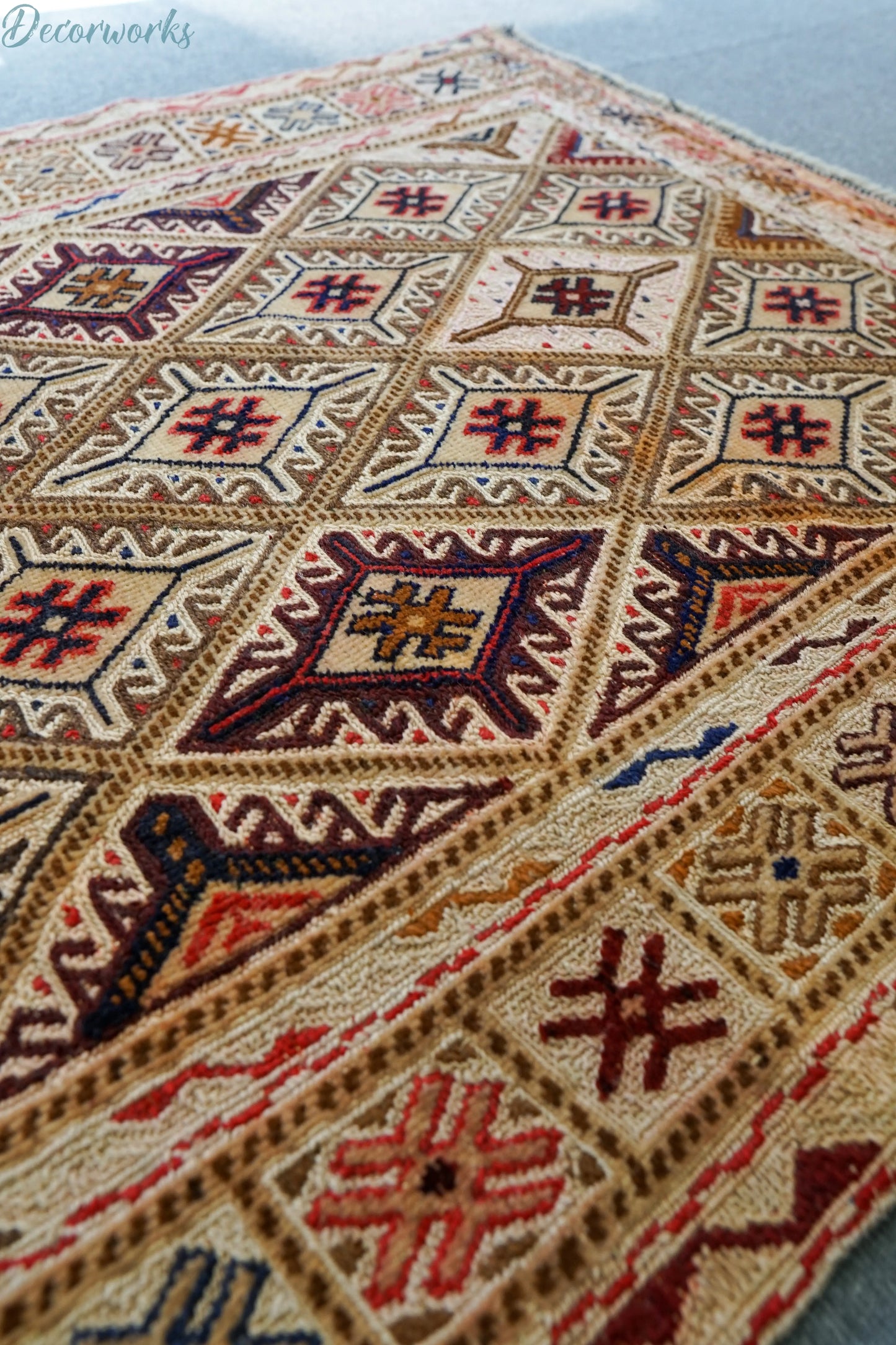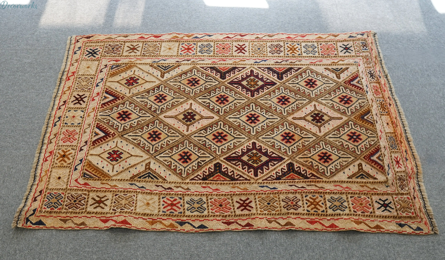 毛足のない麻のような肌触りのキリムと、パイル地の絨毯部分を合わせもった凸凹のある絨毯で、幾何学的なデザインが美しく、踏み心地も大変良いです。
